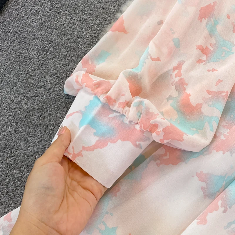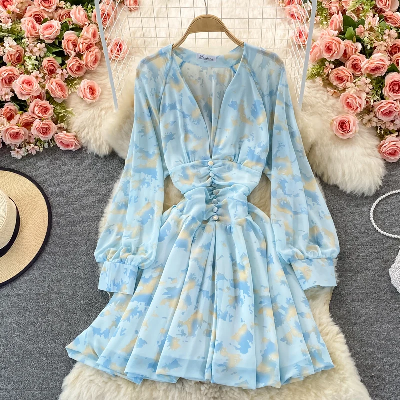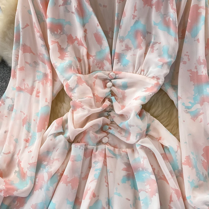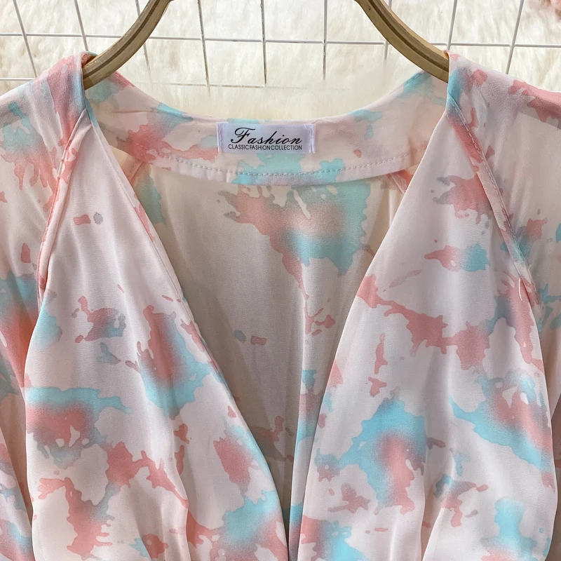 Women V-Neck Tie-Dye Chiffon Dress 2023 Spring Autumn New A Sexy Cute Mini Casual Dress
