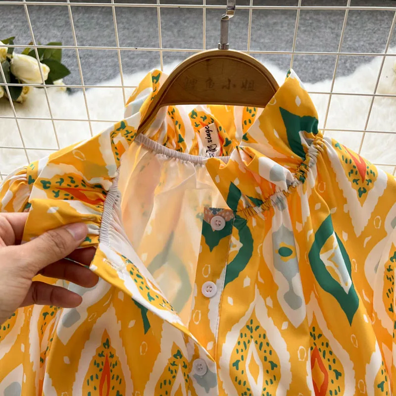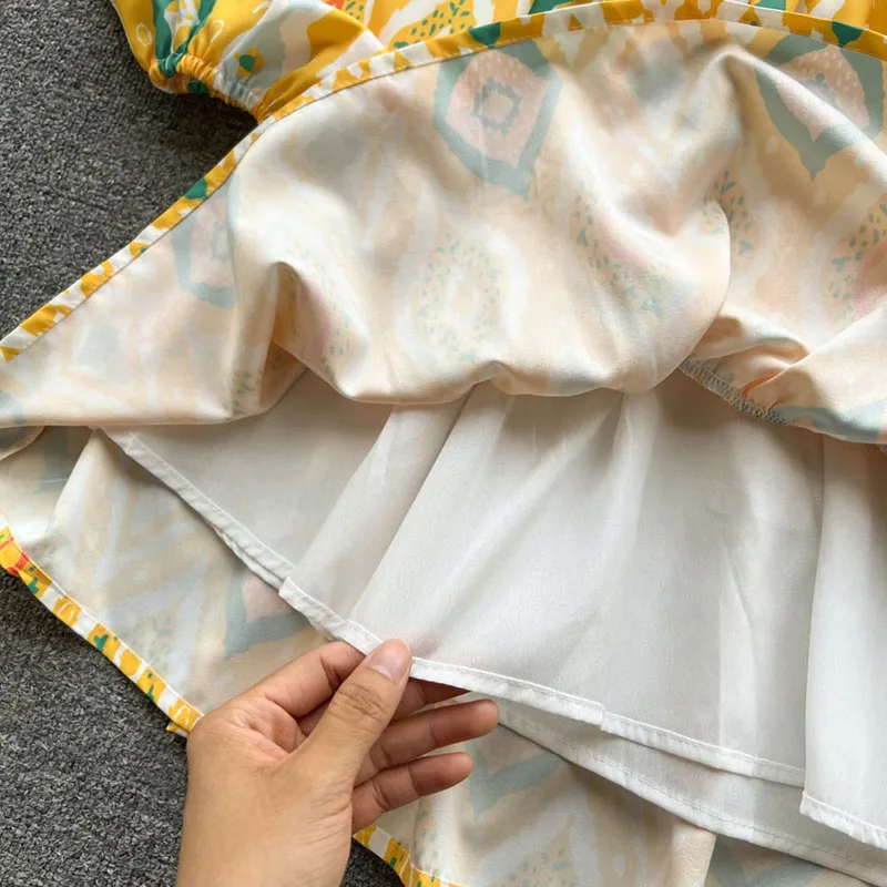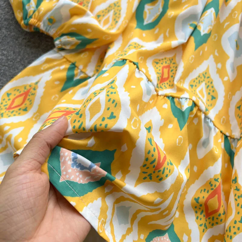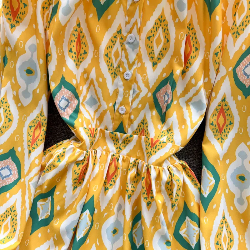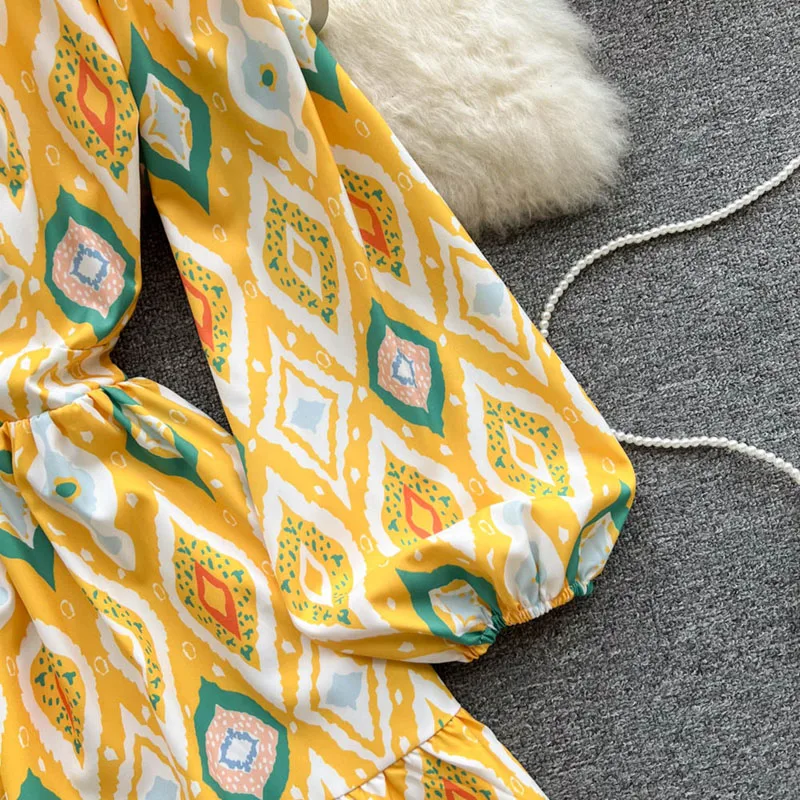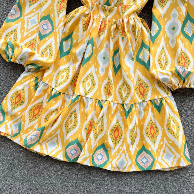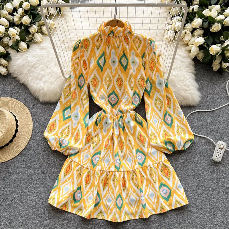 Women Vintage Bohemia Lantern Sleeve High Waist Print A-Line Dress