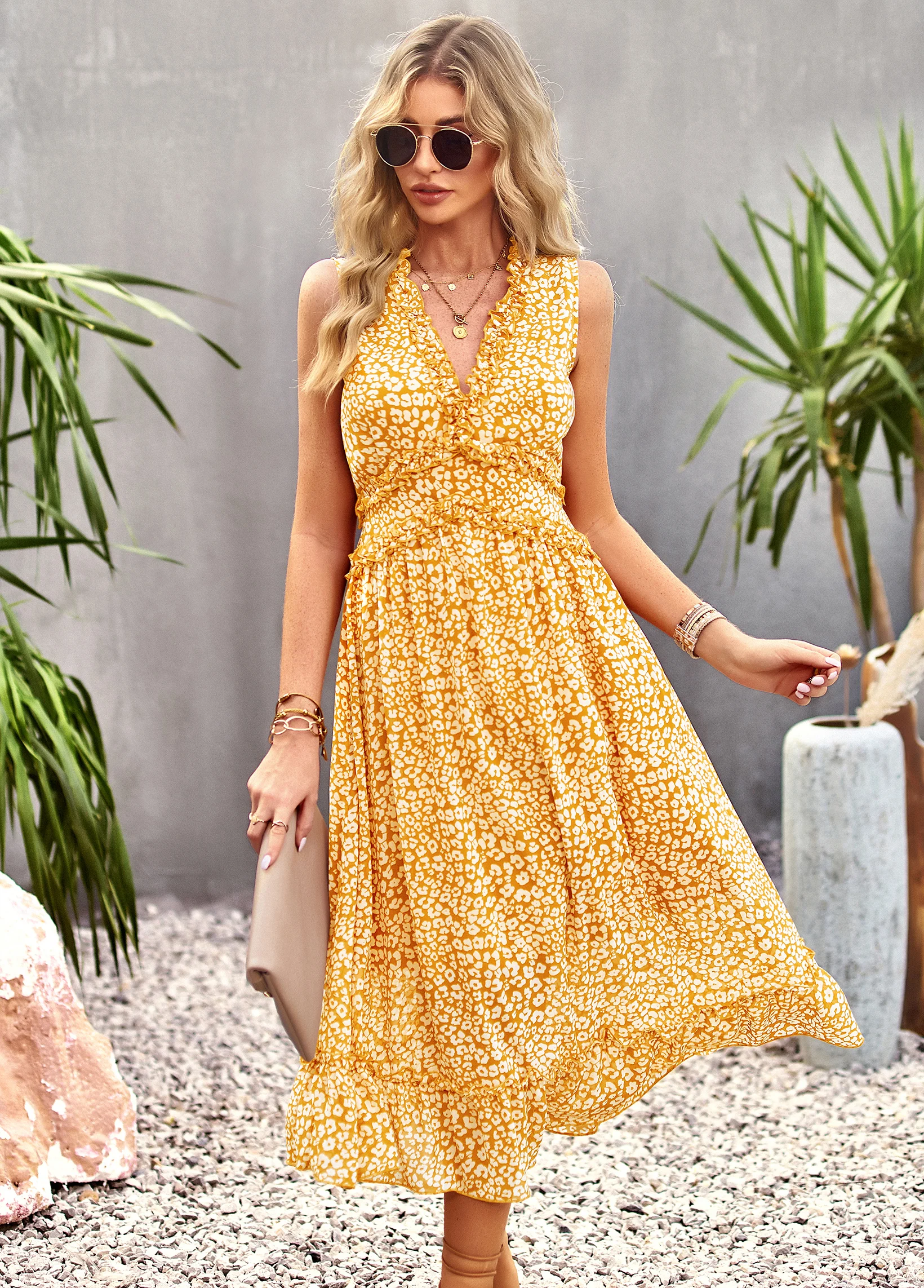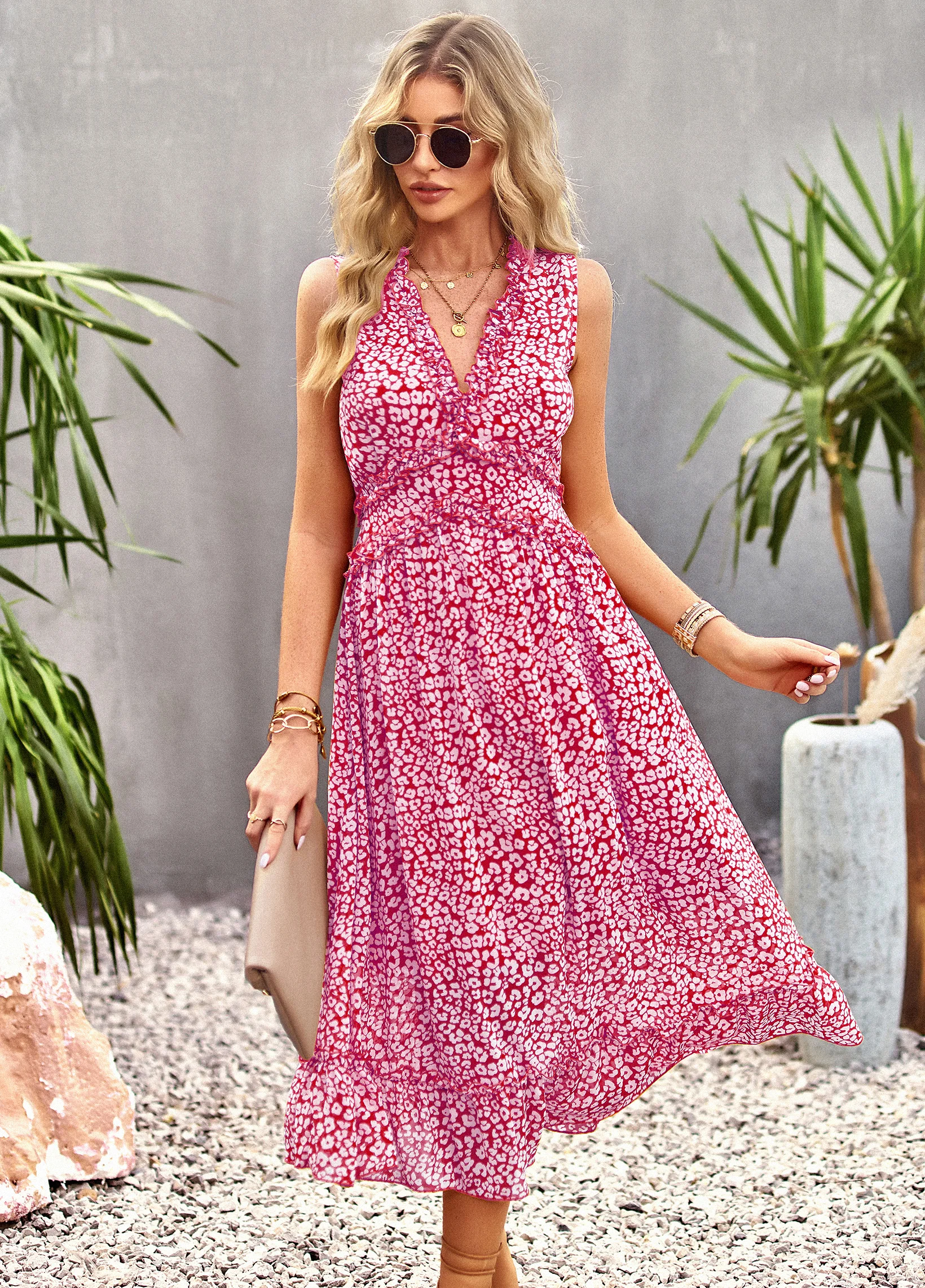 Women Vintage Floral Leopard Printed V Neck Ruffles Midi Dress Casual Beach Dresses Multi Colour