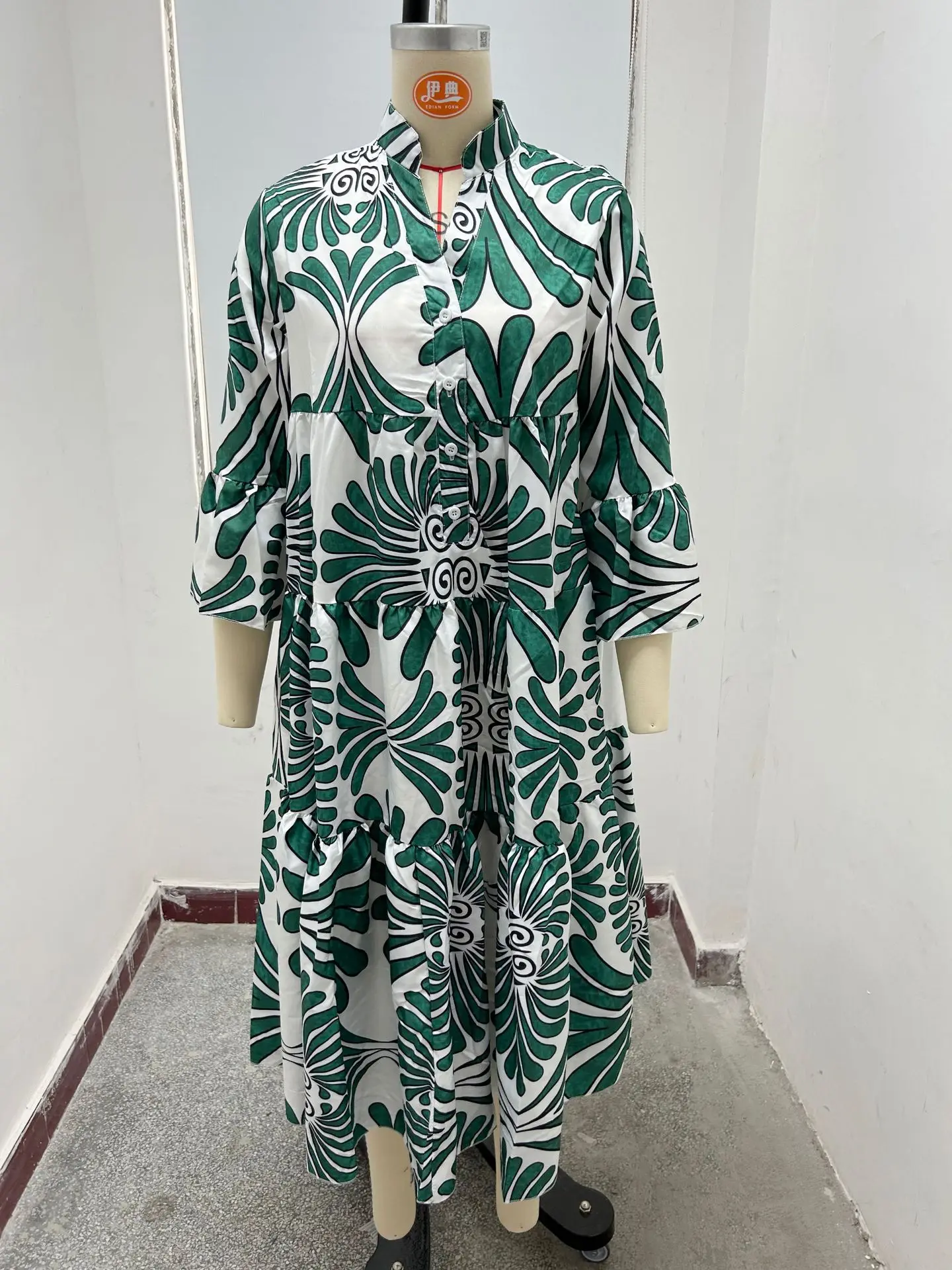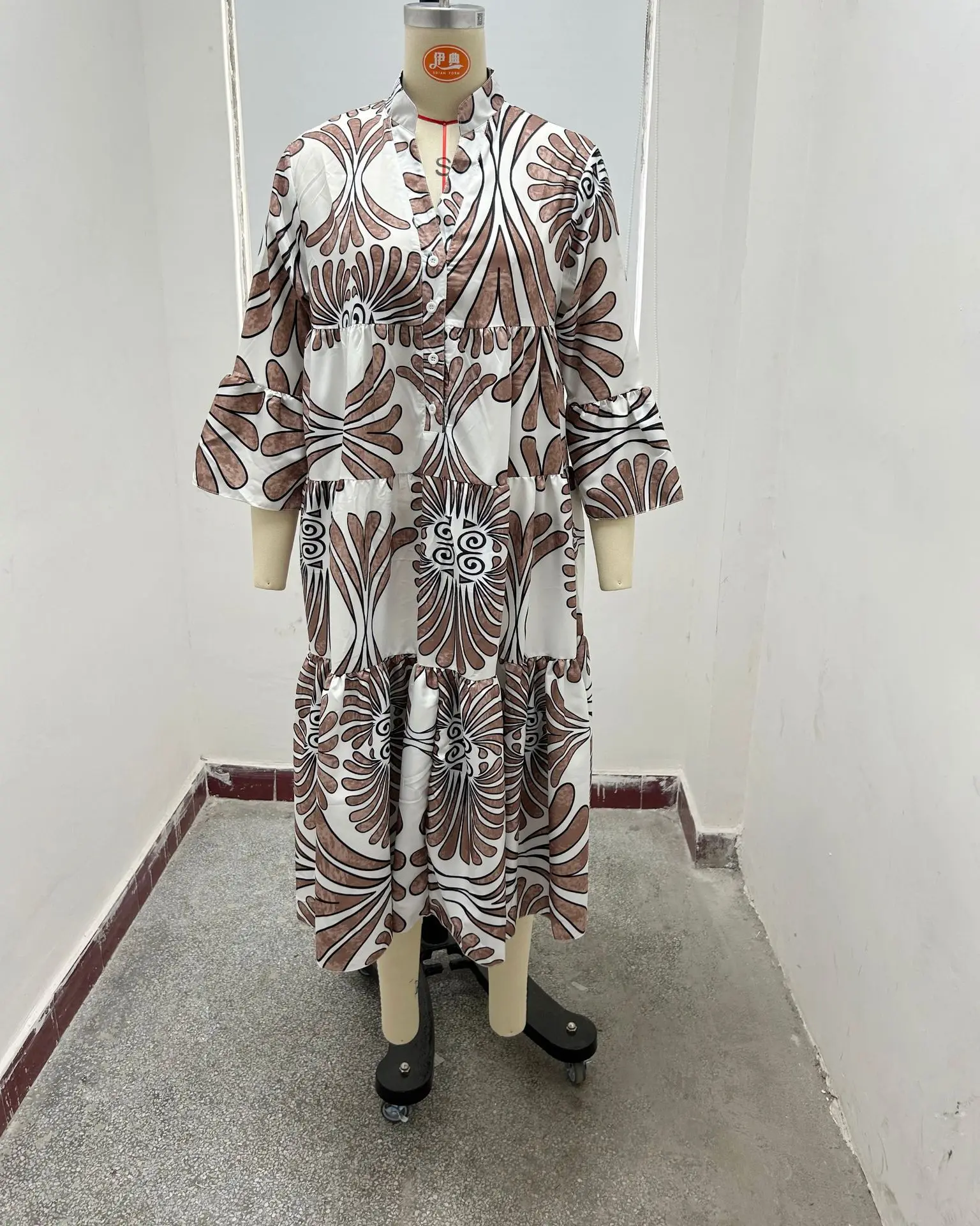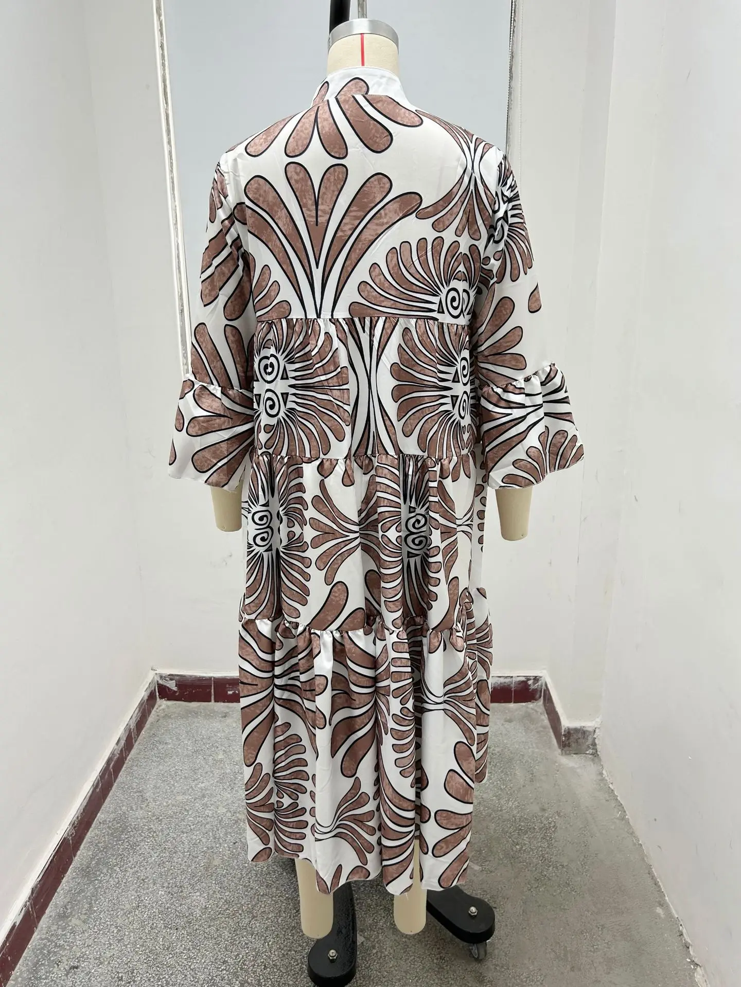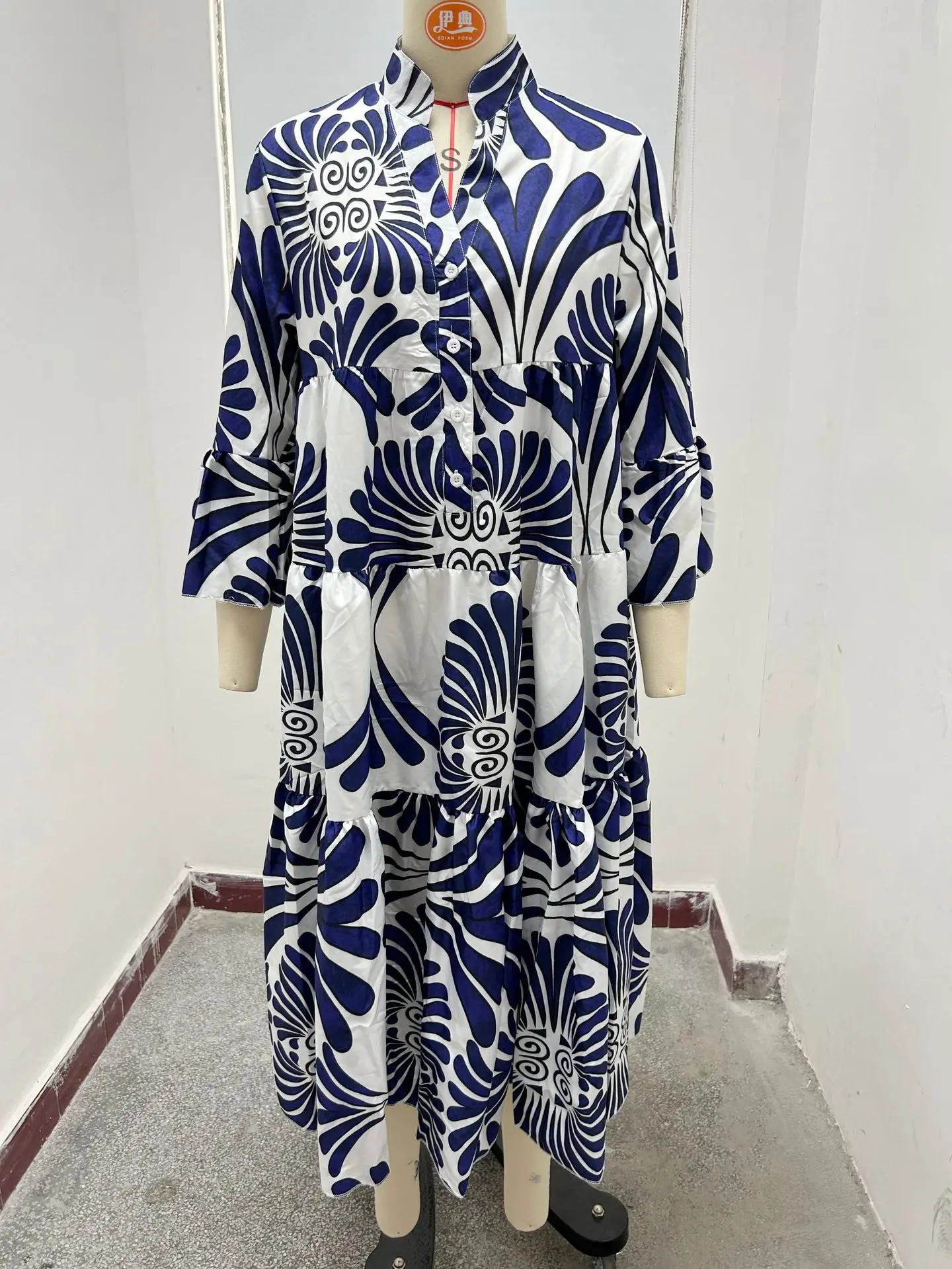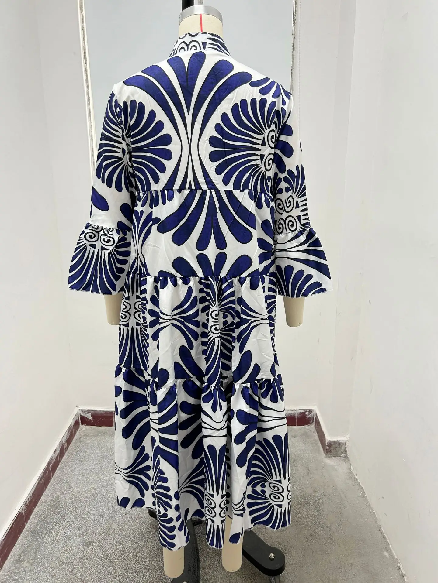 Women Vintage Print Maxi Dress Summer Casual Turn-down Collar Long Sleeve Long Dress Female Boho Beach Shirt Dress Holiday Robe