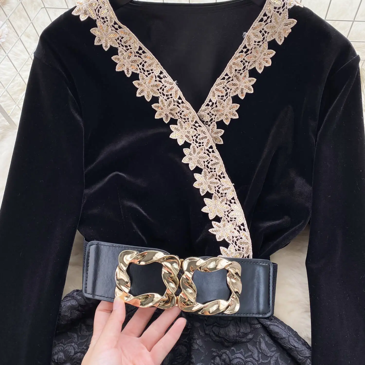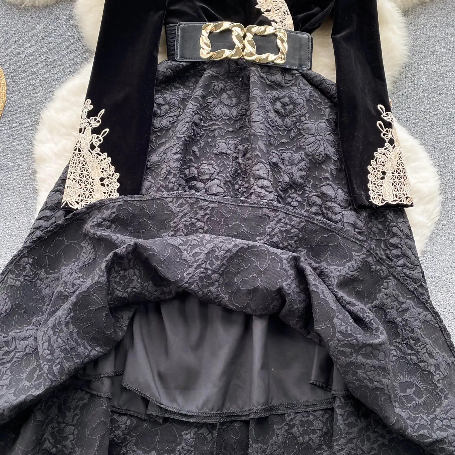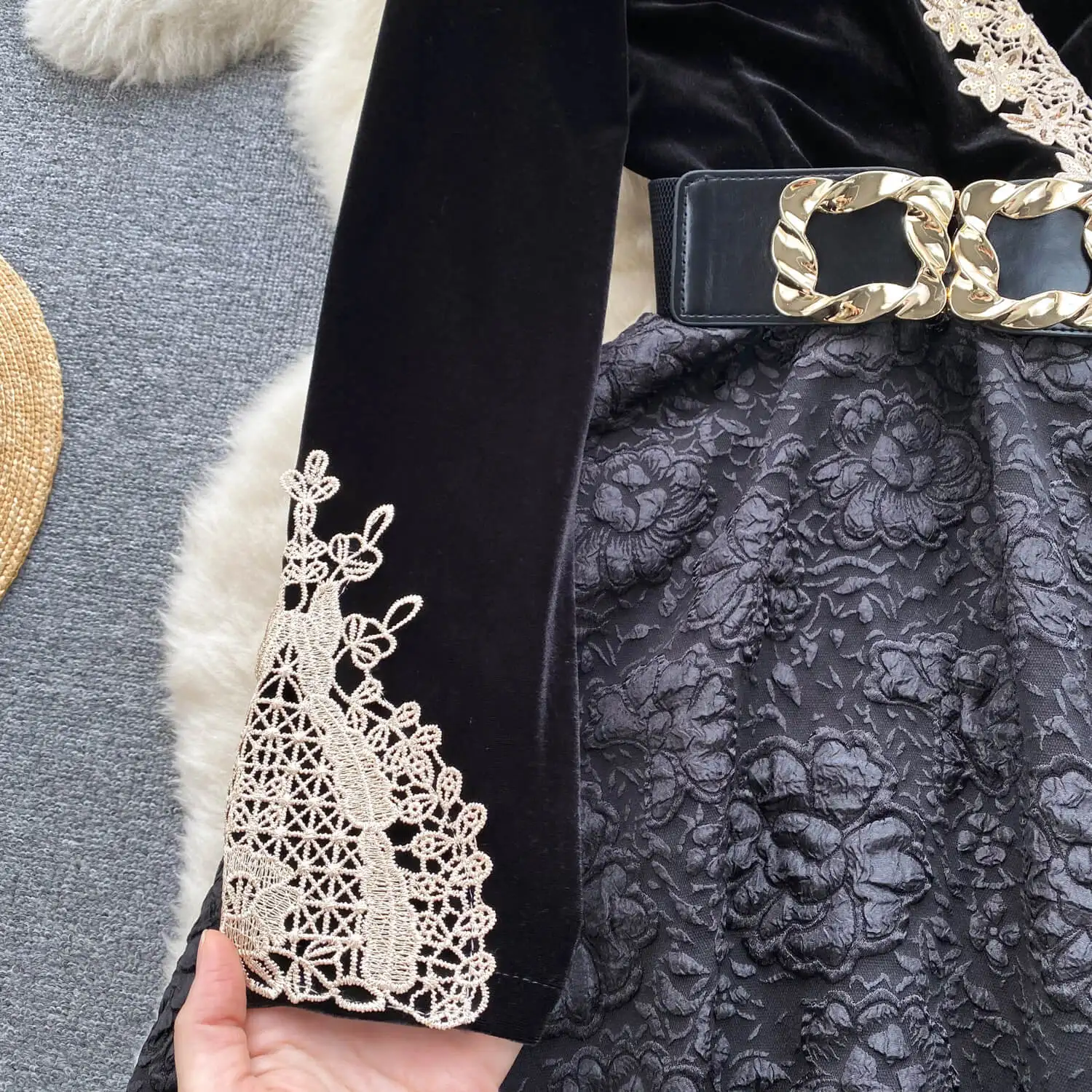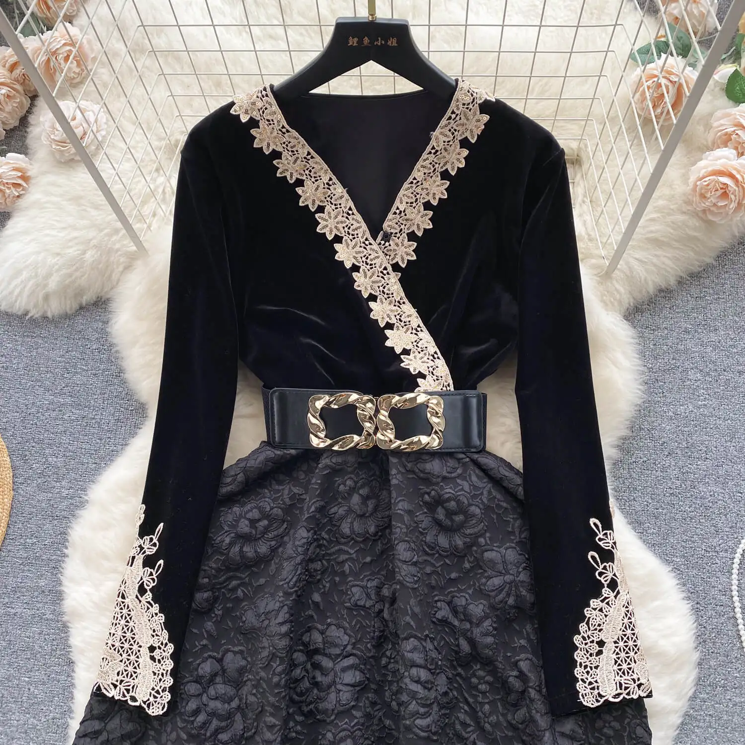 Women's Autumn 2023 New French Herben-Style Lace Patchwork Vintage Velvet Dress