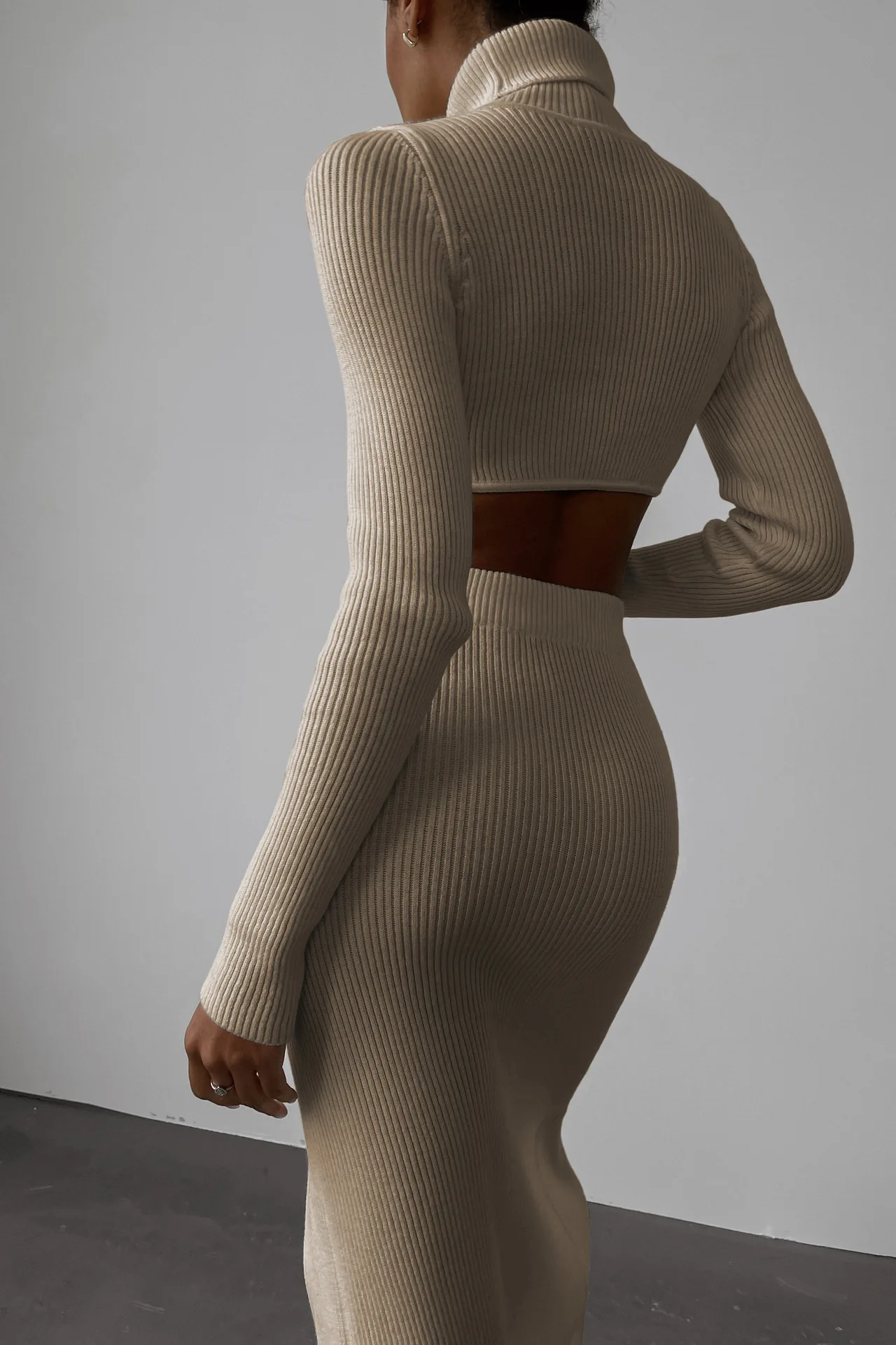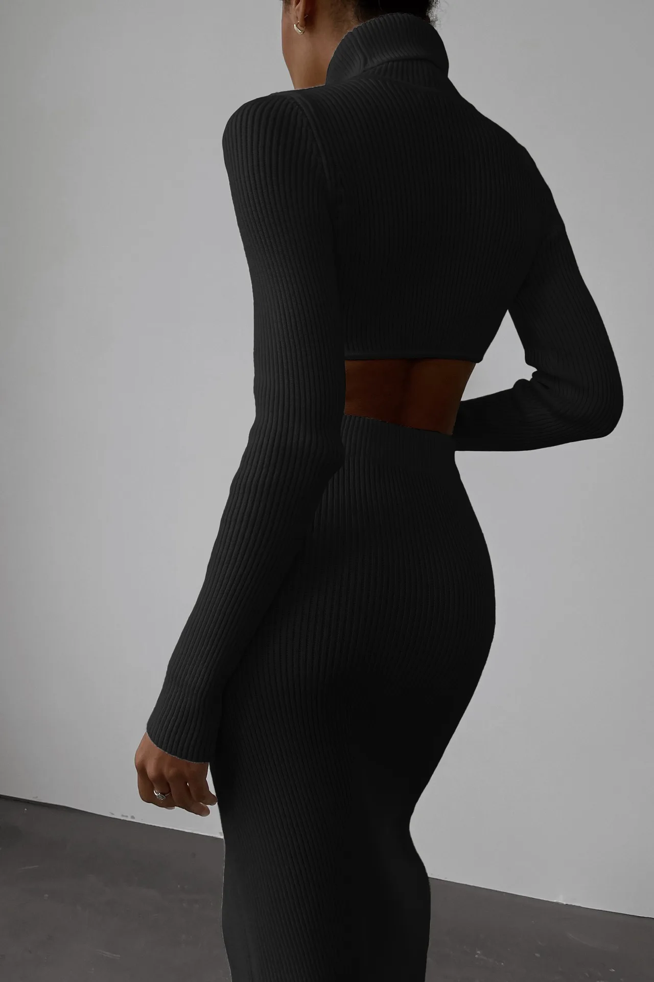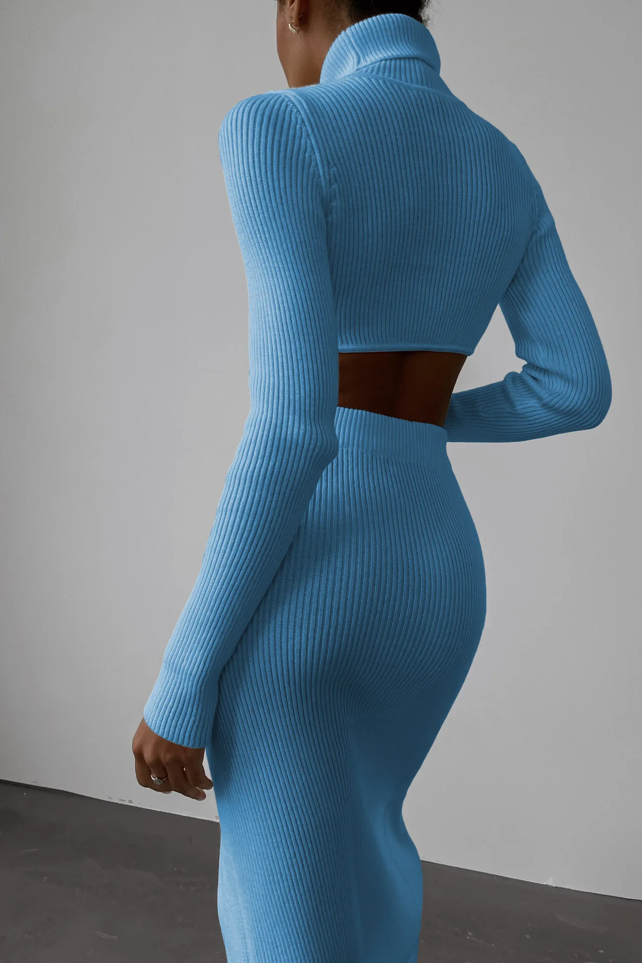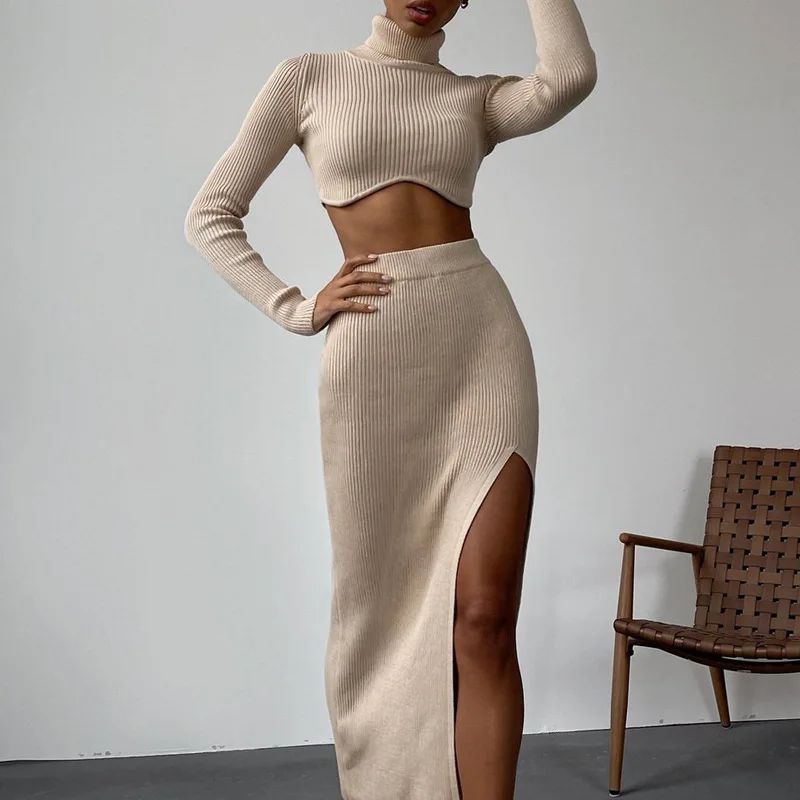 Women's Autumn And Winter New Fashion Thread High Neck Short Knitwear High Waist Slit Skirt Set