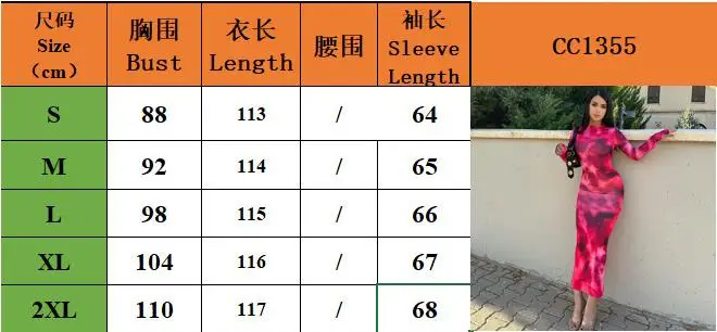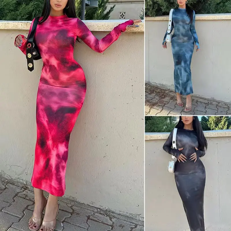 Women's Autumn Winter New Tie-dye Long Sleeve Round Neck High Waist Dress Printed Long Slim Spice Girl Dress Woman