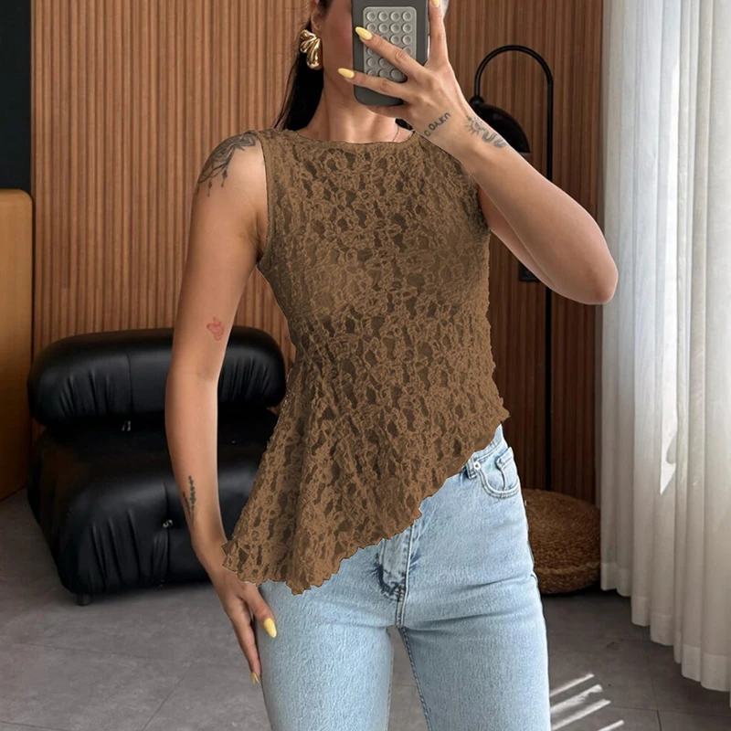 Women's Casual O Neck Sleeveless Irregular Tees 2025 Summer Solid Color Waist Blouses Perspective Lace Slim Fit Club Party Tops