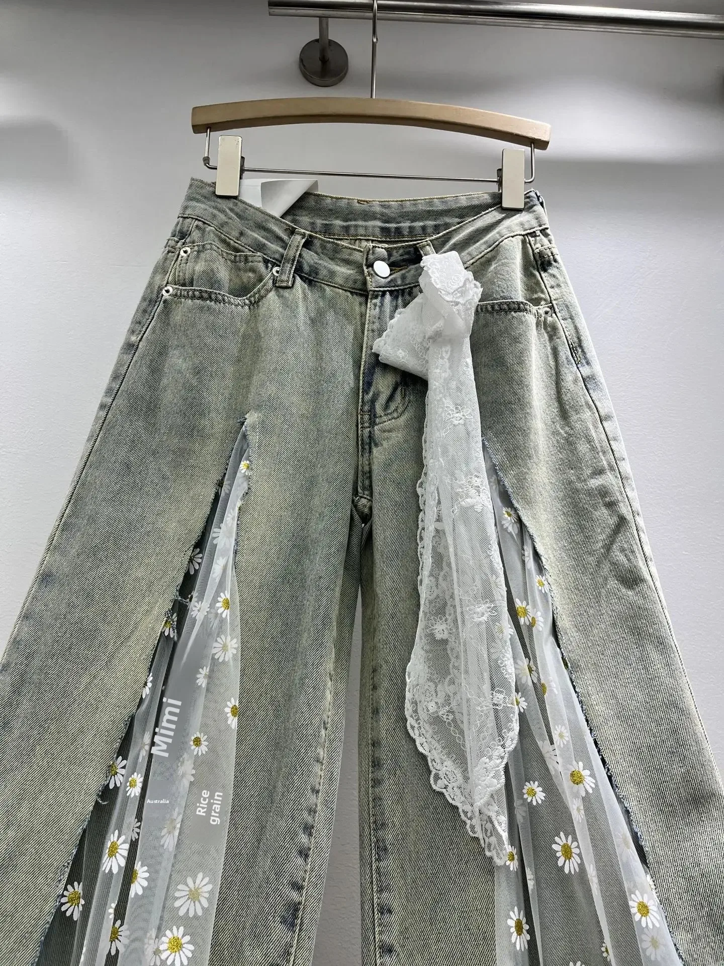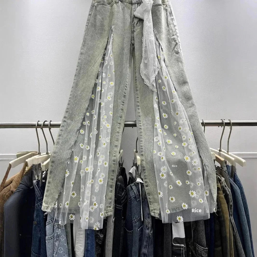 Women's Embroidered Hollow out Wide Leg Jeans Straight Cut Loose Long Trousers Spring Summer Fashionable Cargo Pants
