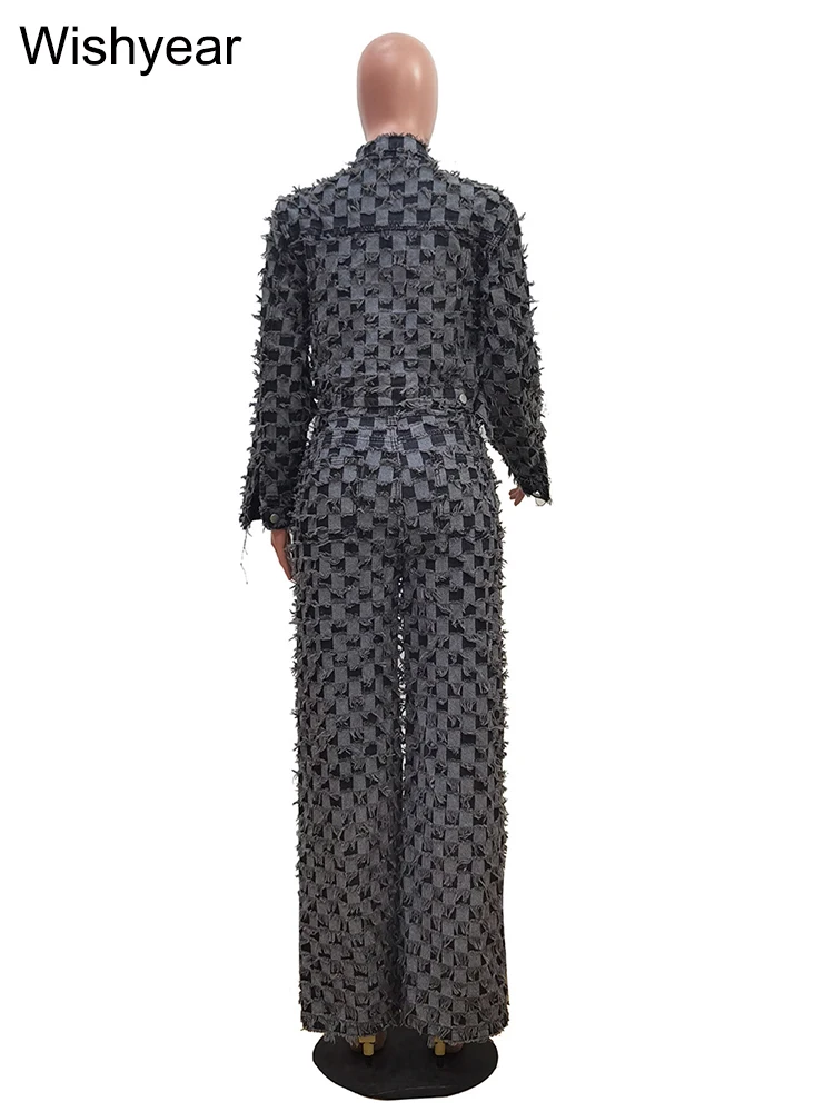 Women's Fashion Gray Denim 2 Piece Set Long Sleeve Patchwork Jacket And Wide Leg Pants Streetwear Grid Wash Jeans Autumn Outfits