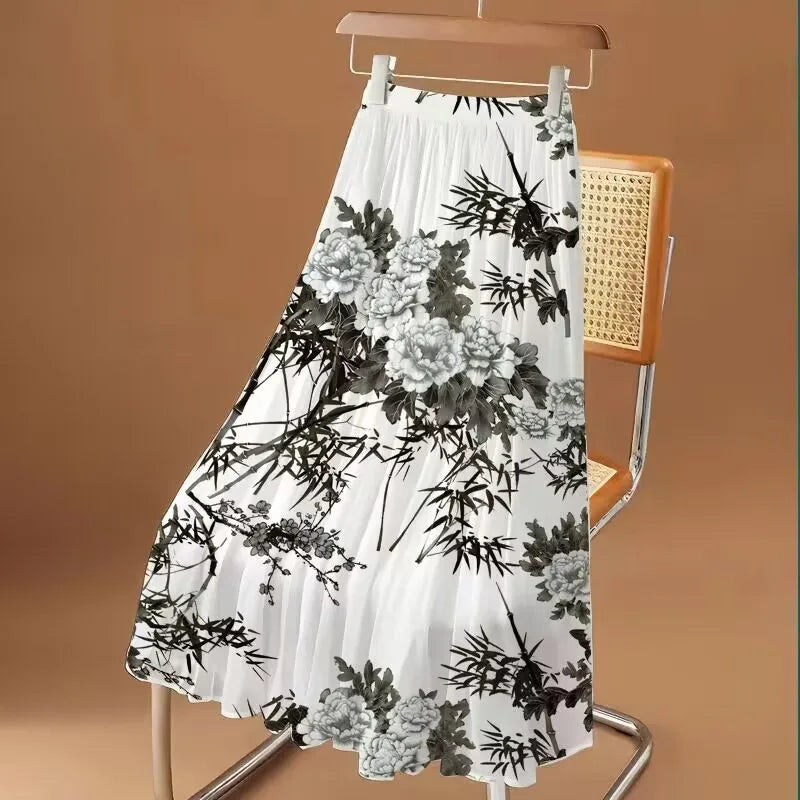 Production Name:Fashion Floral Printed Long Chiffon Skirt Women Elastic High Waist A Line Max Pleated Summer Skirt Jupe Longue