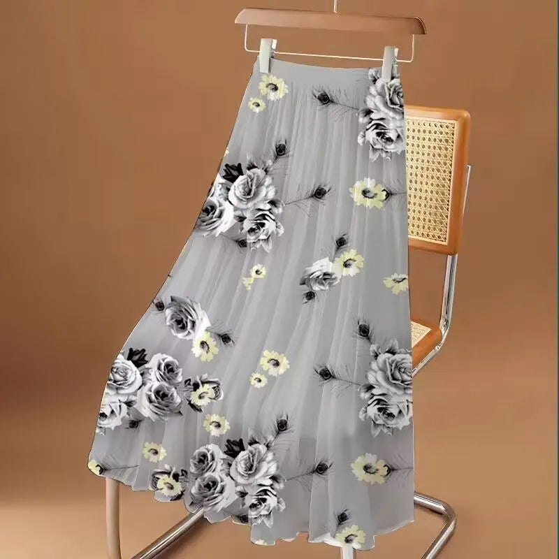 Women's Floral Printed Long Chiffon Skirt, Elastic, High Waist, A Line, Max Pleated, Summer, Fashion