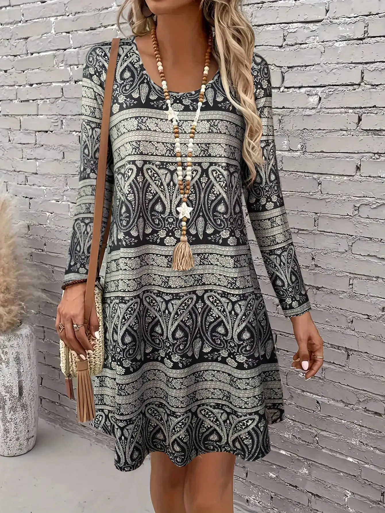 Women's Full Body Allover Print Long Sleeve Dress For Spring,Fashion Round Neck Mini Dress