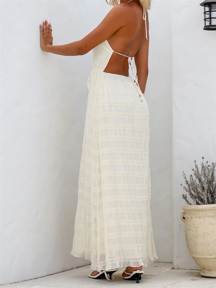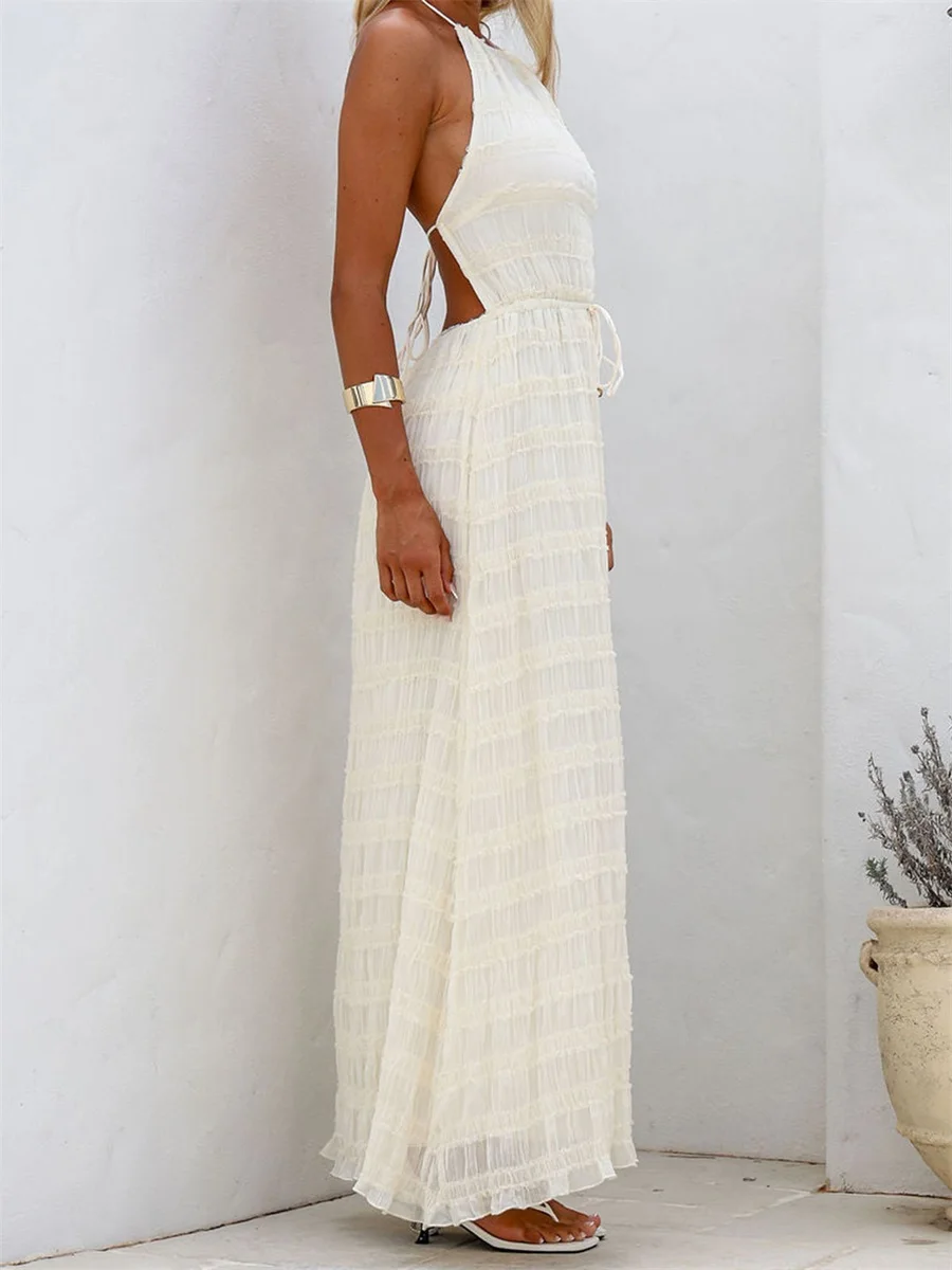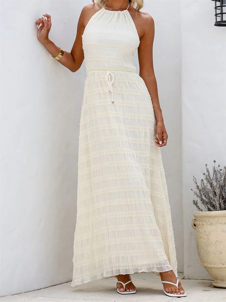 Women's Halter Neck Long Dress Frill Layered Solid Dress Drawstring Belted Sleeveless Dress