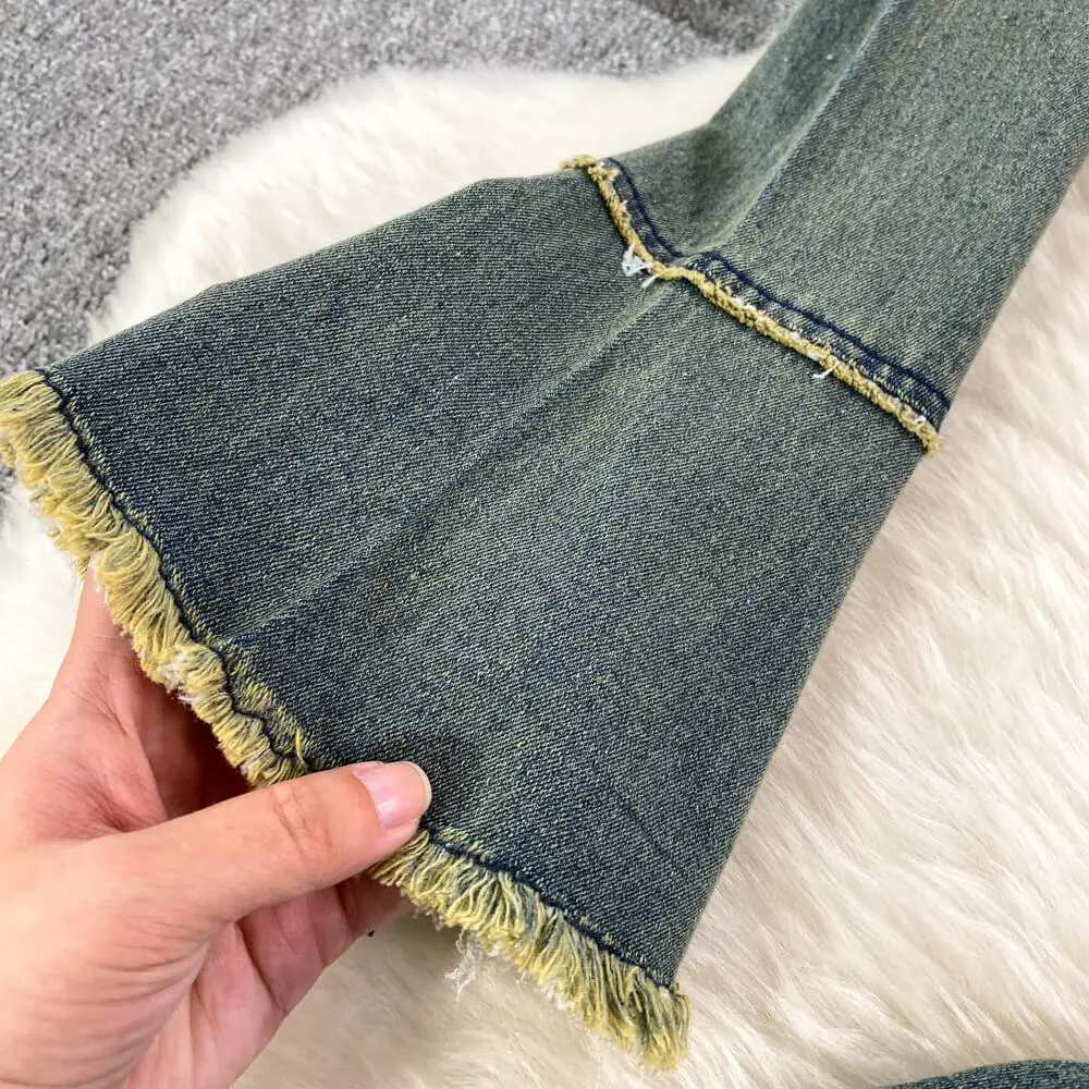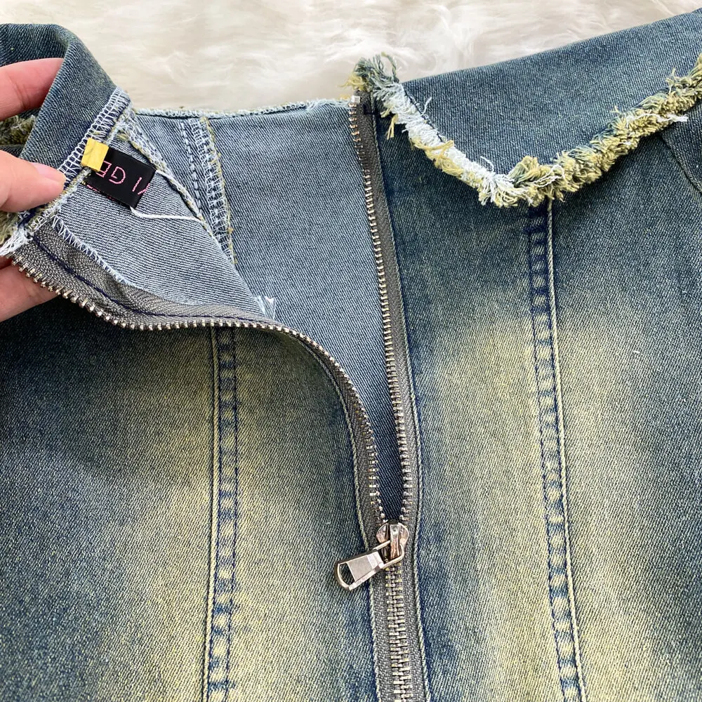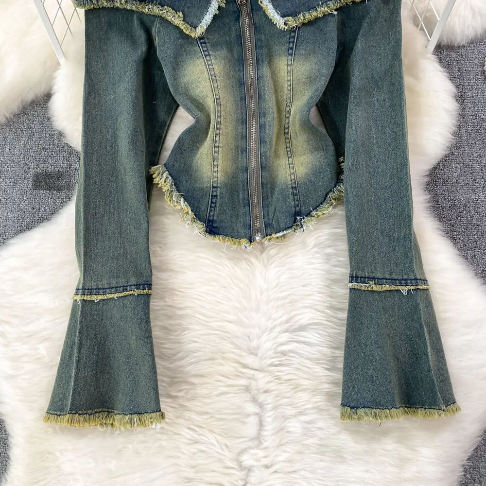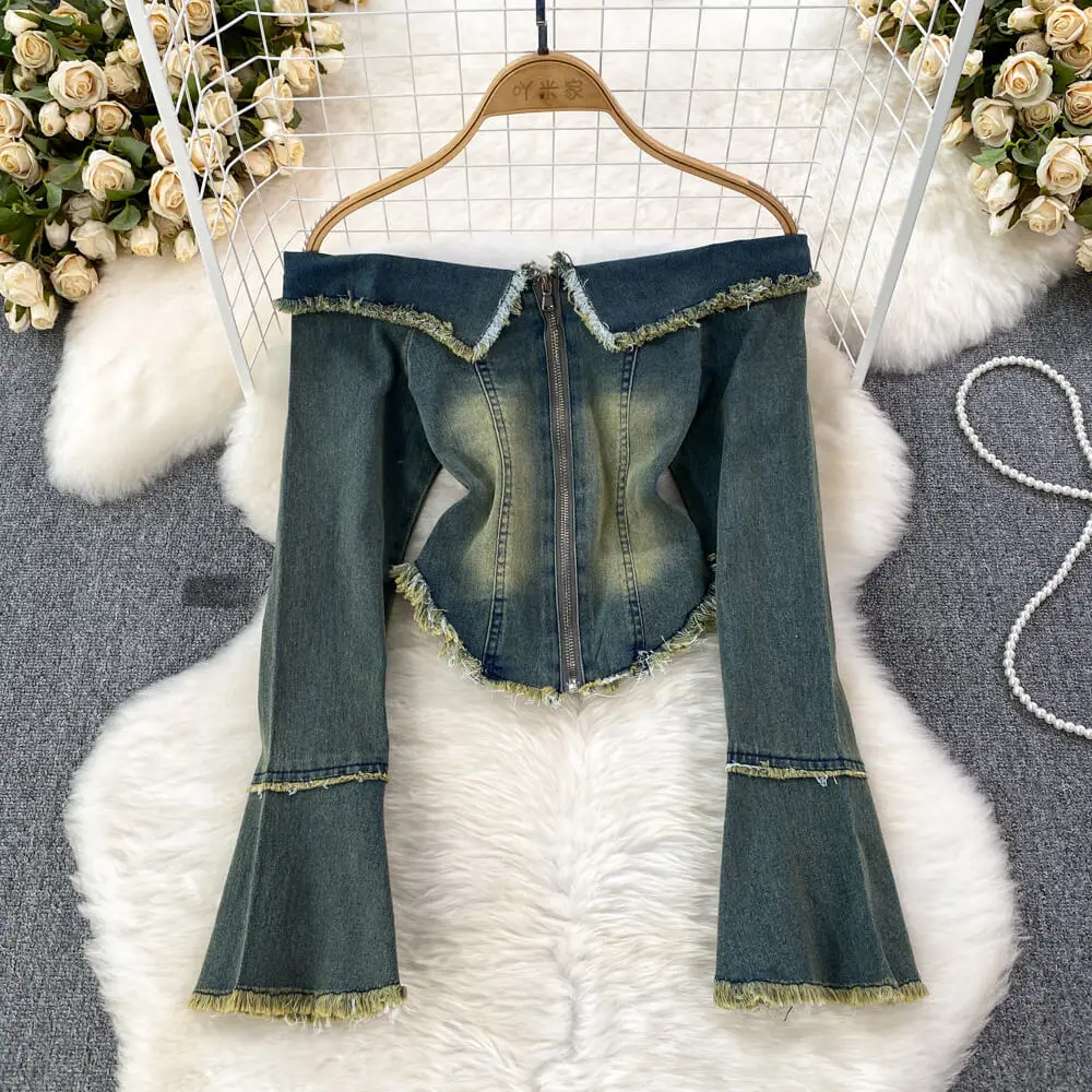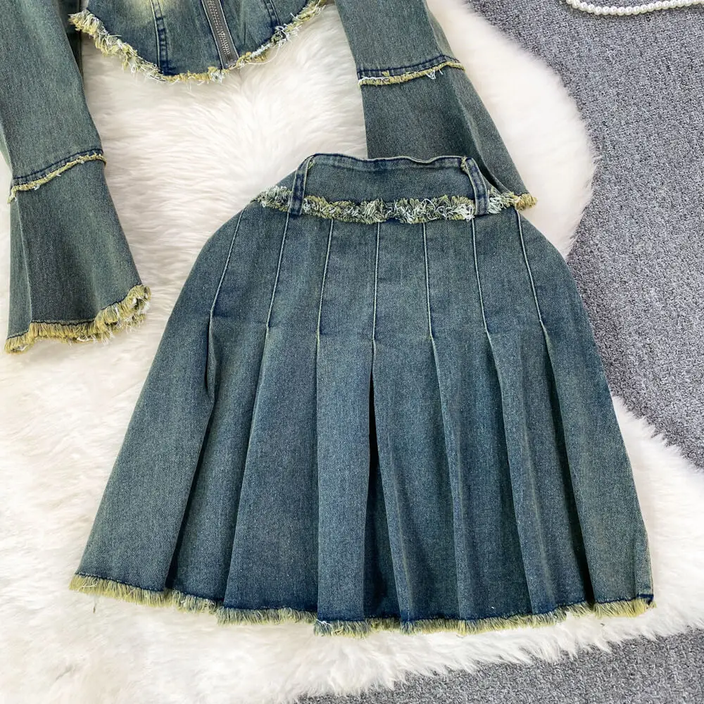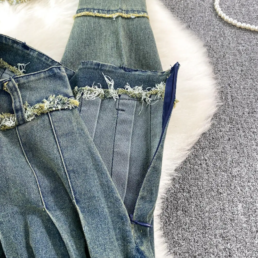 Women's New Autumn Vintage Washed Raw Edge One-Line Shoulder Slim Top Pleated Skirt Denim Set