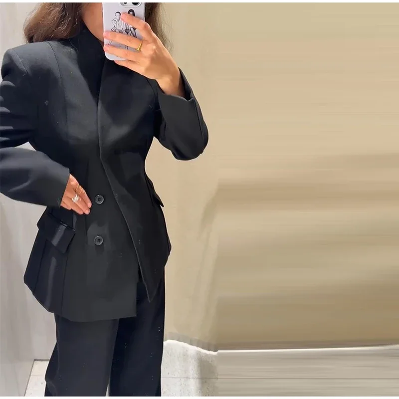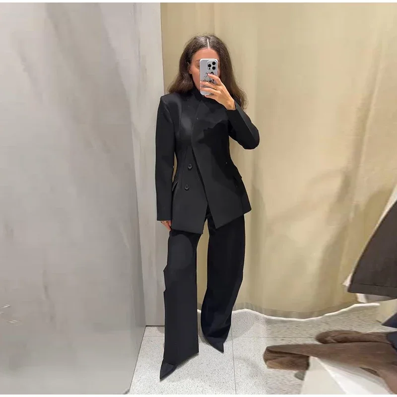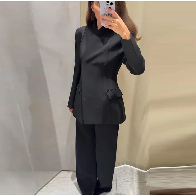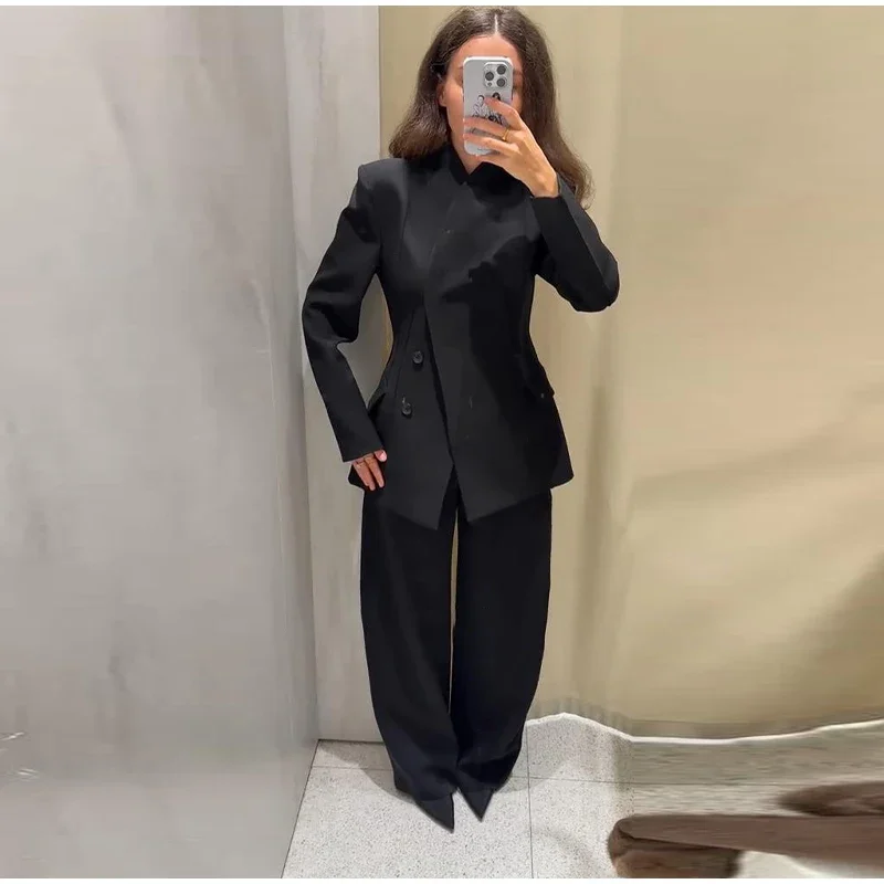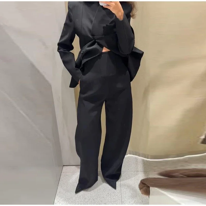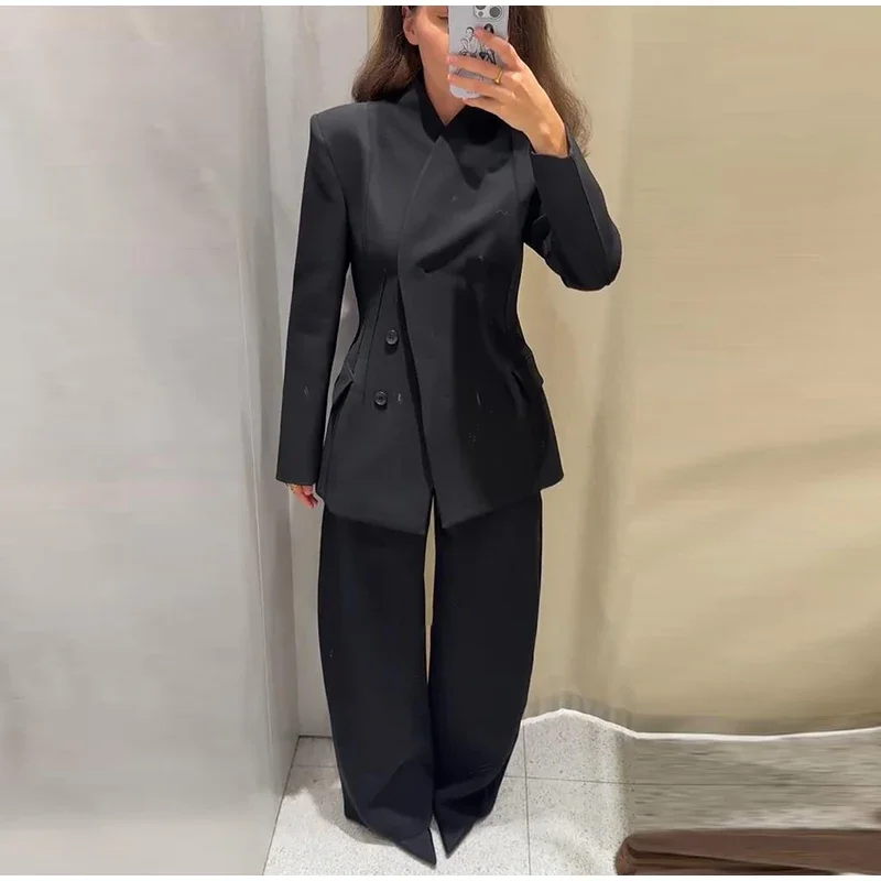 🌟 Command Attention with This Tailored Black Blazer Set, Featuring a Double-Breasted Jacket & Wide-Leg Pants for Power Dressing.