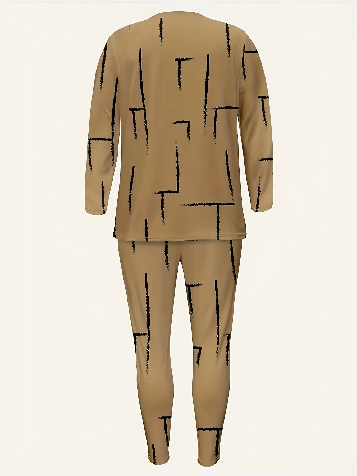 Women's Plus Size Casual Outfit: Comfortable Long Sleeve Crewneck Top and Geometric Print Pants Set - Medium Stretch, Machine Wa