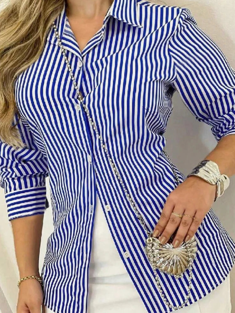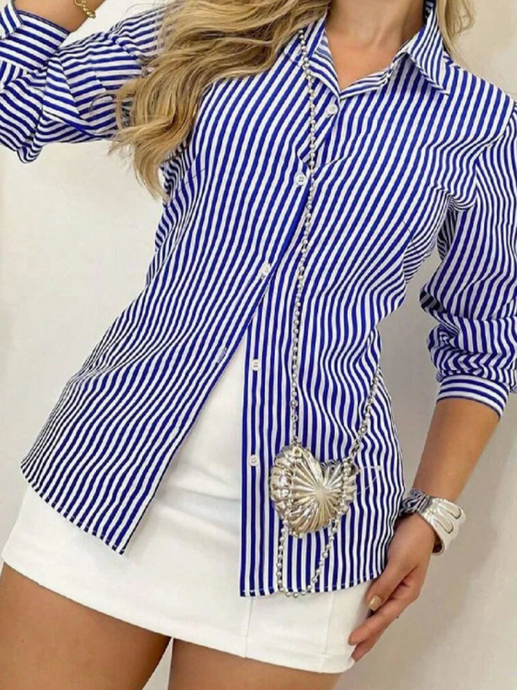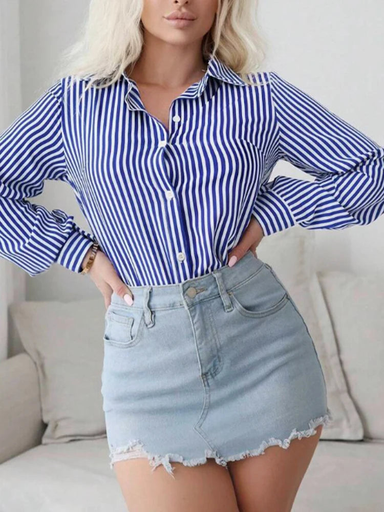 Women's street style thin classic business blue and white striped button-up lapel long-sleeved shirt