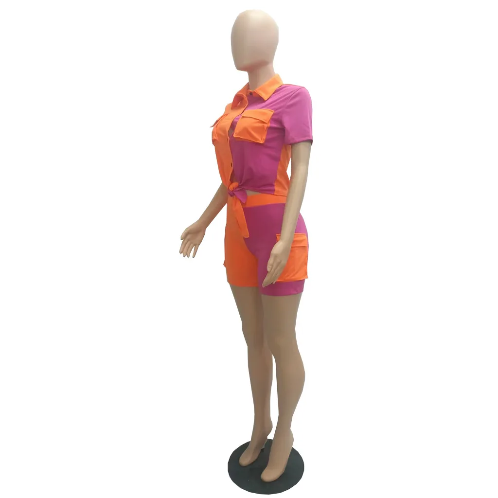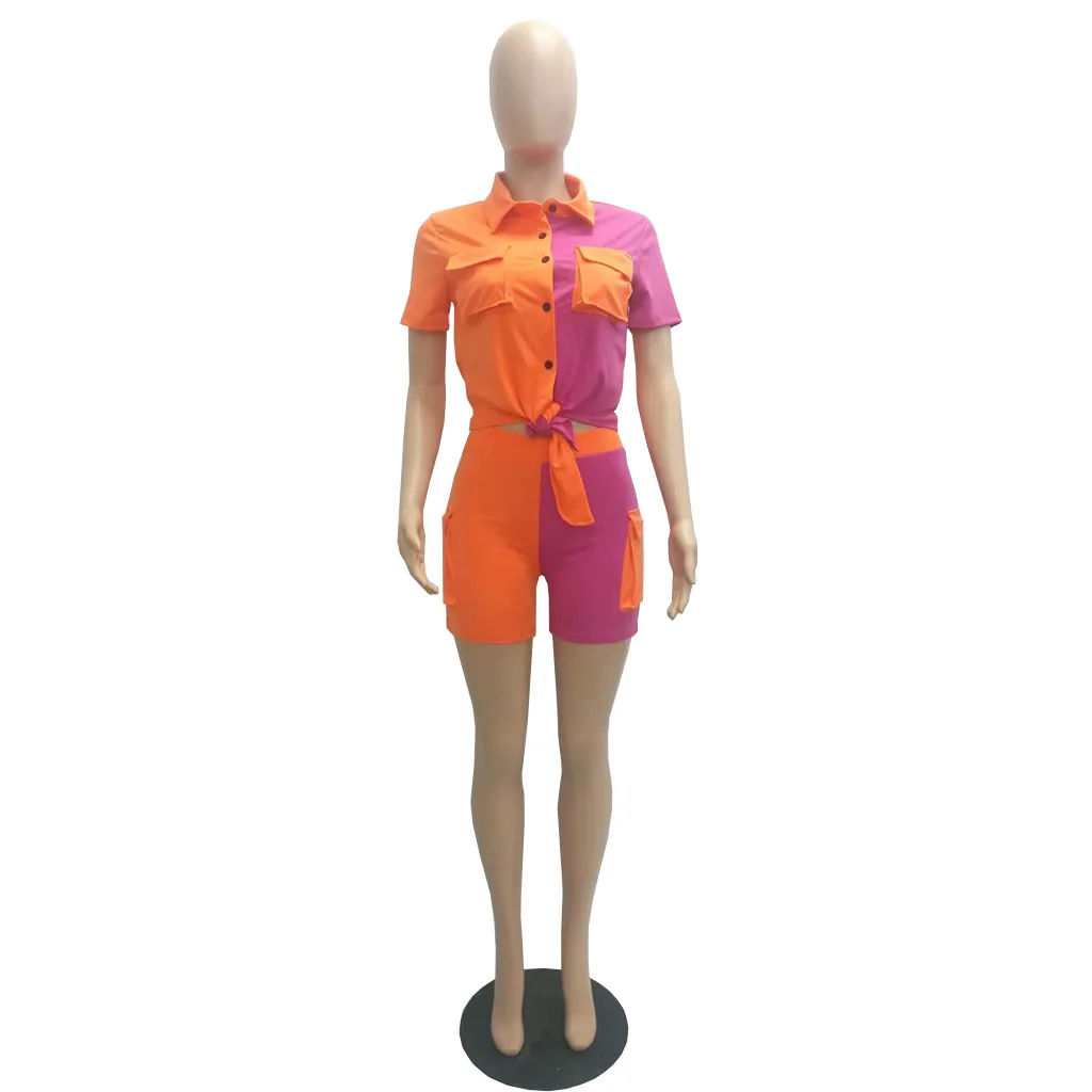 Women's summer urban style shirt with contrasting color three-dimensional pocket short-sleeved shorts two-piece set