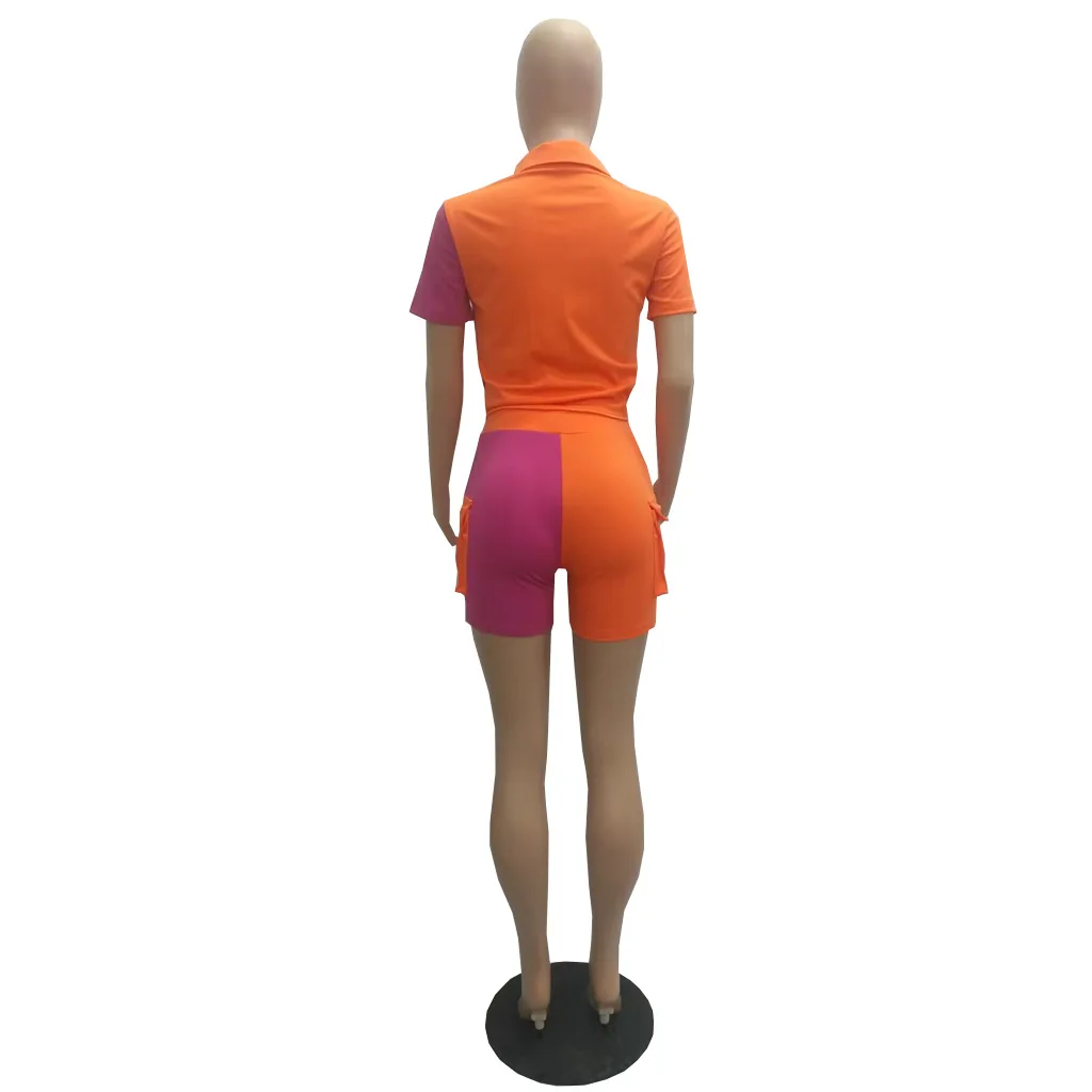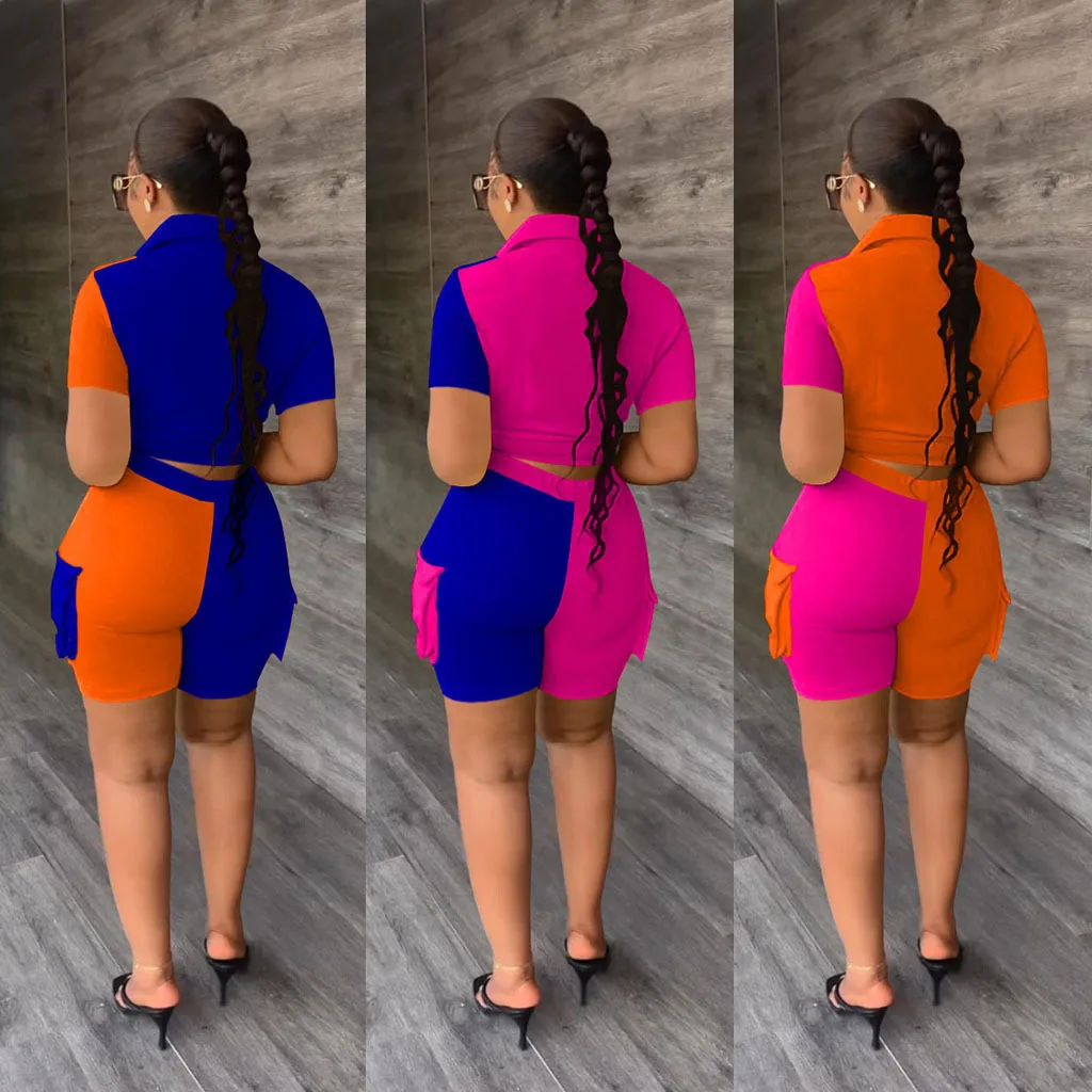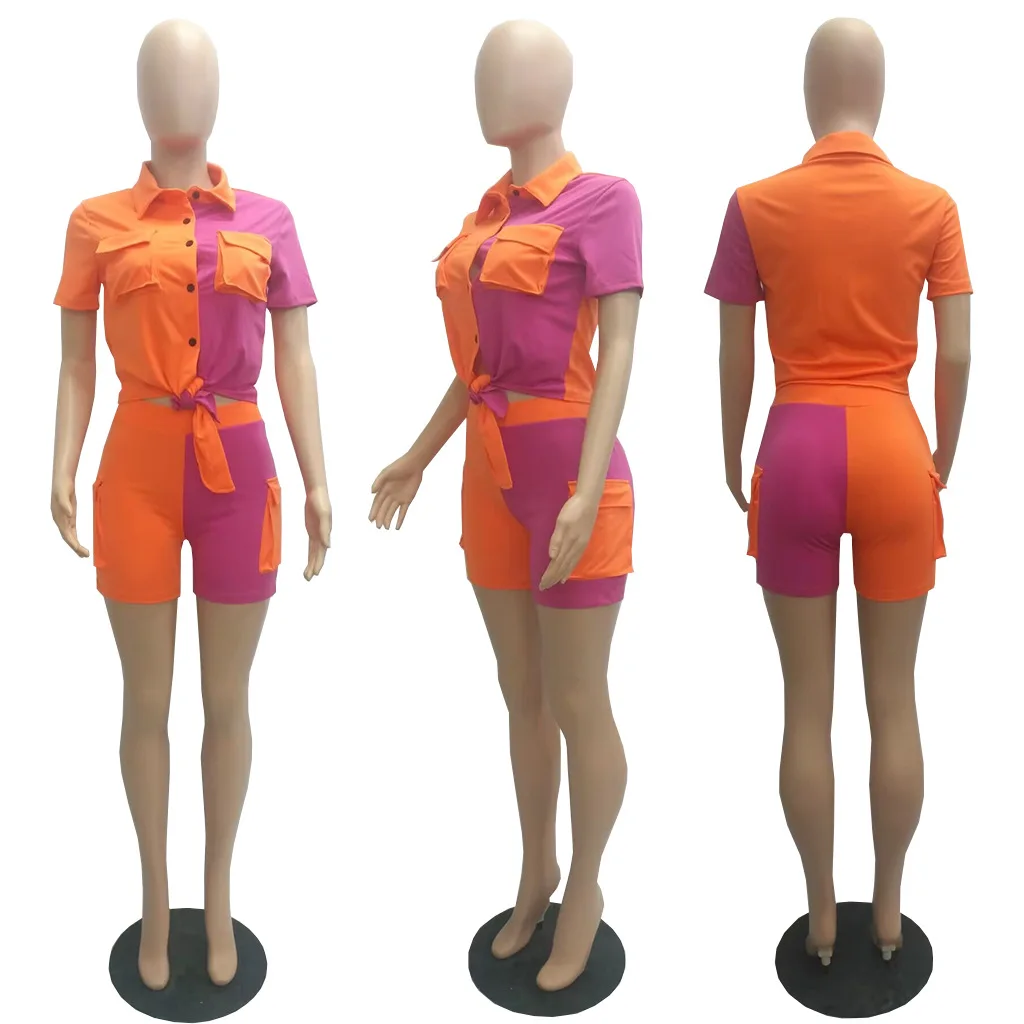 Women's summer urban style shirt with contrasting color three-dimensional pocket short-sleeved shorts two-piece set