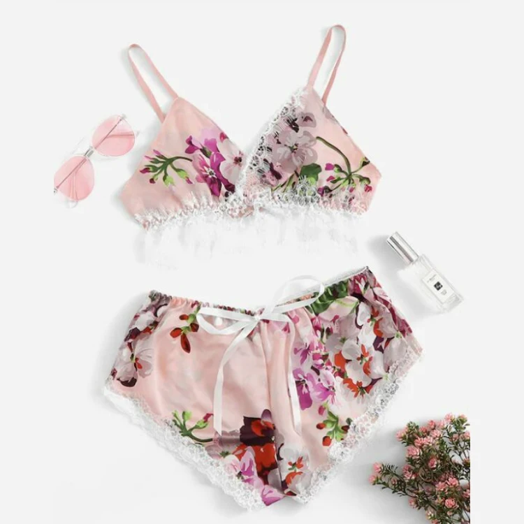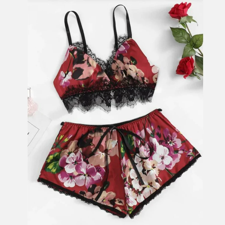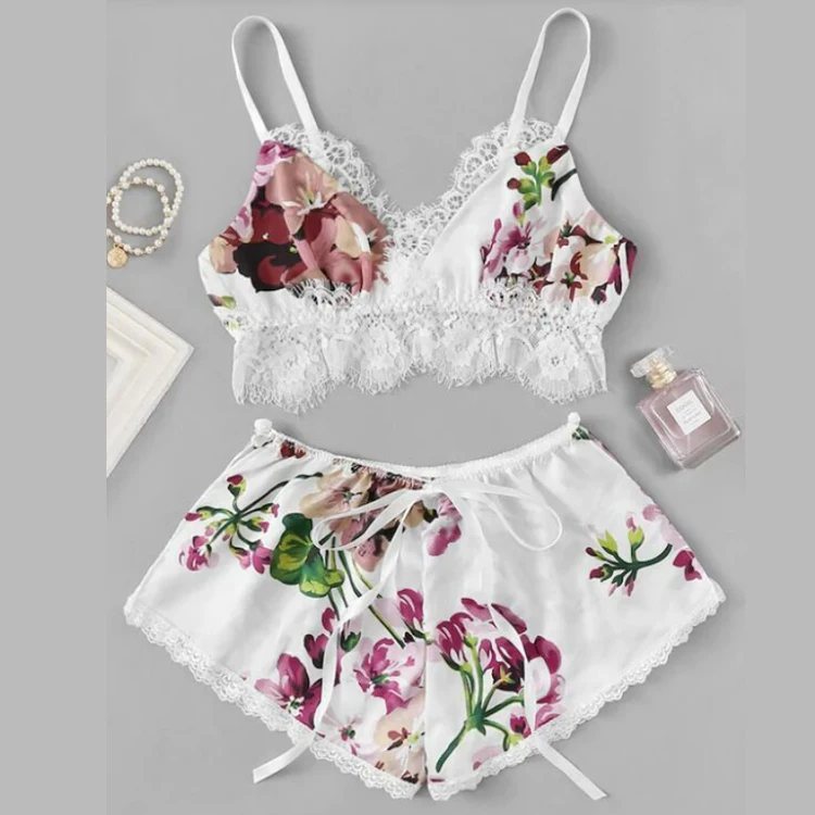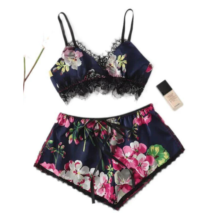Women's V-Neck Bra Silk Sleepwear Home Charming Satin Lace Floral 2 Pieces Pajamas Short Pants Set