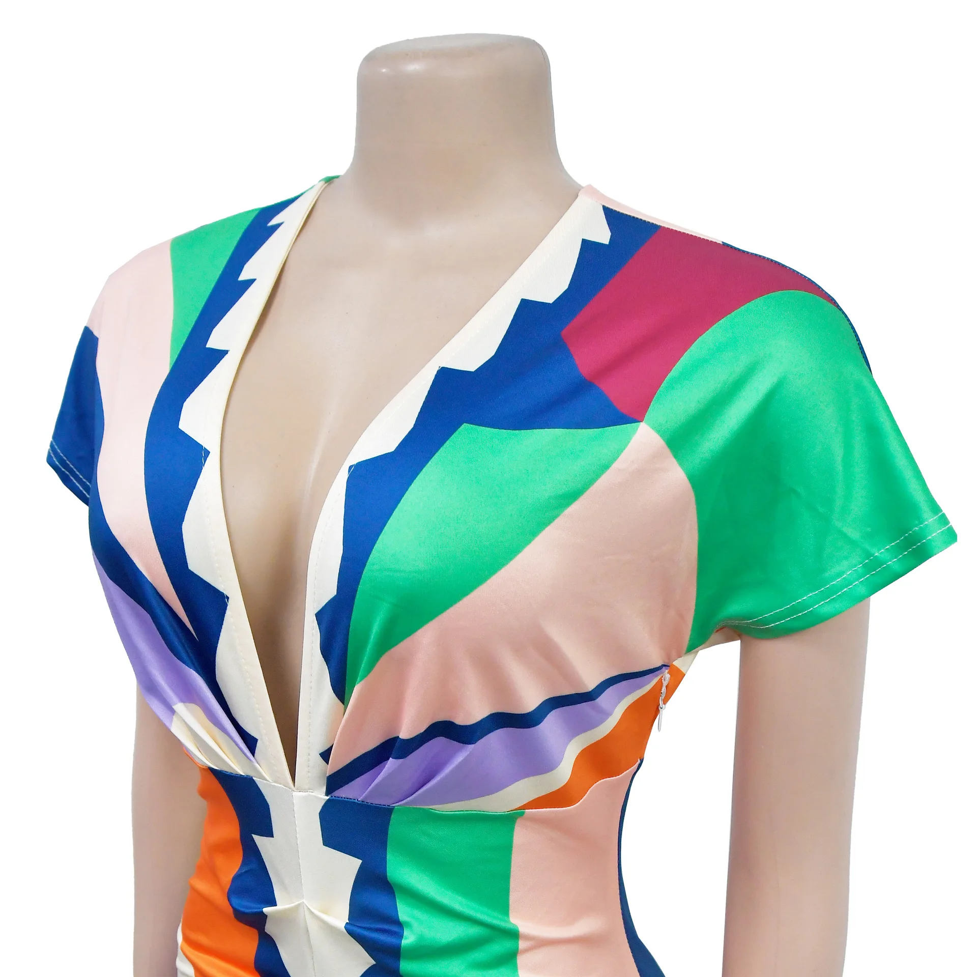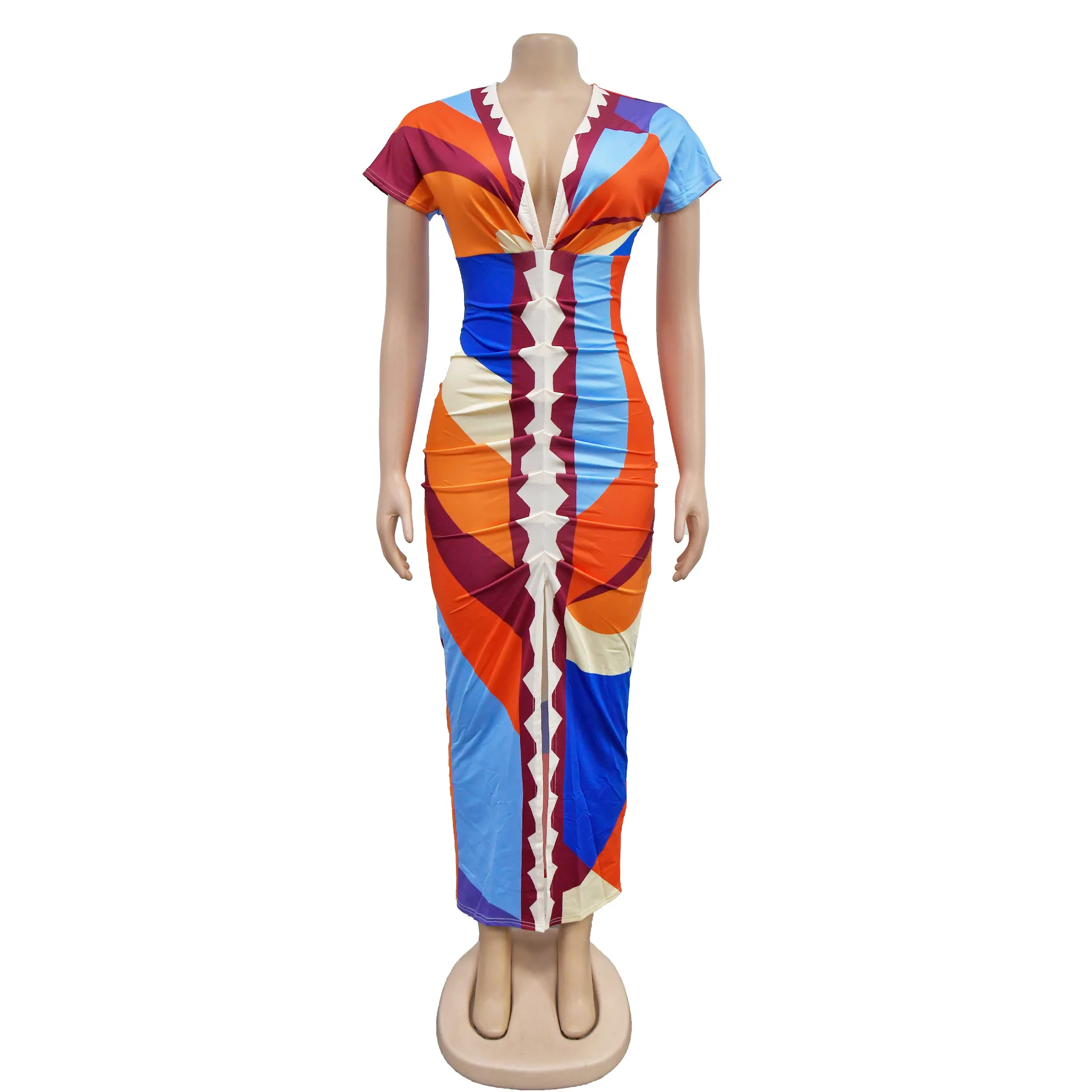 X6660 2024 New Design Plus-size Women's V-neck Print Slit Pleated Maxi Dress