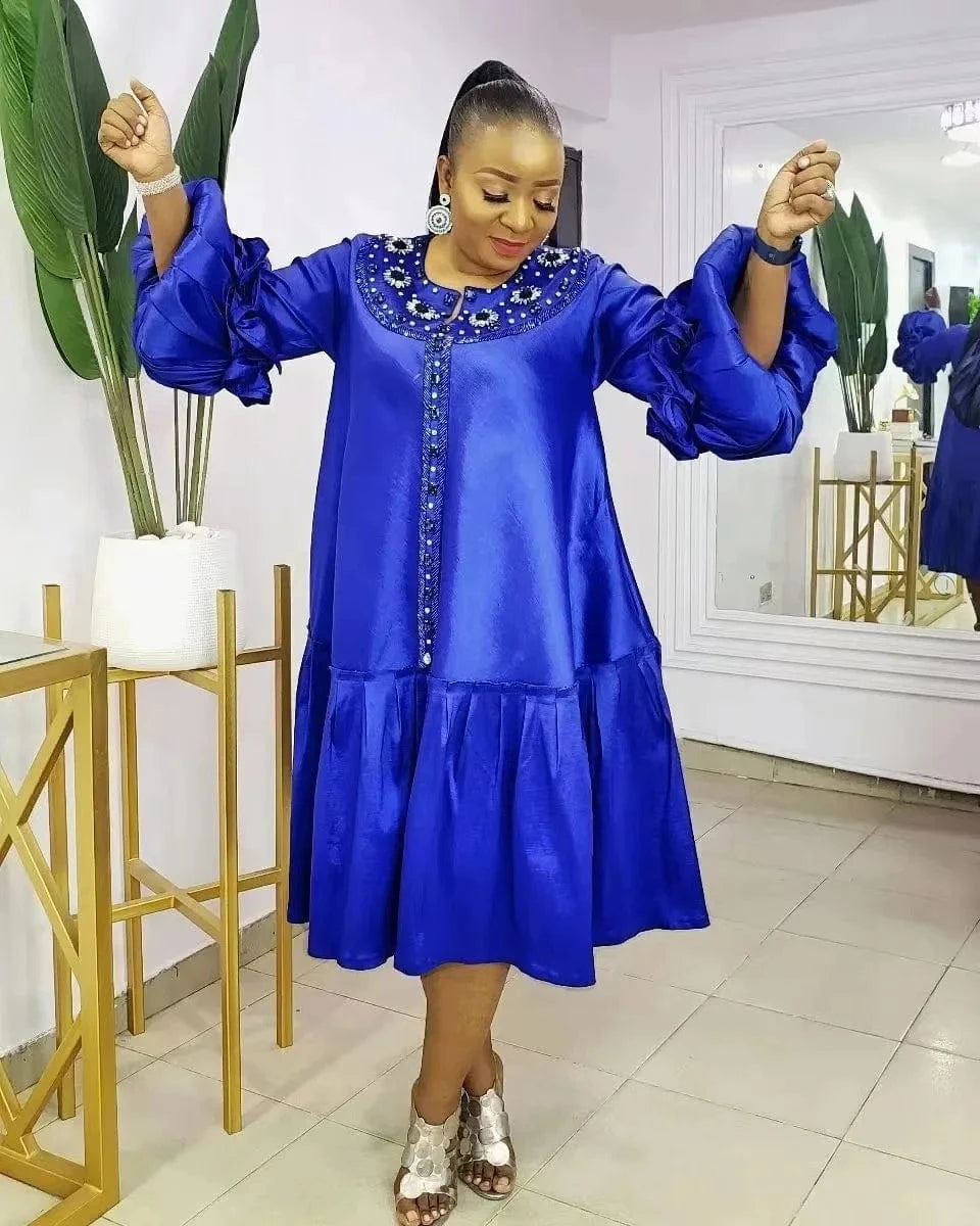 xxl-5xl Plus Size 2024 Spring Long Sleeve Satin Muslim Robe Dress Elegant Loose Maxi Beaded Dress Party Dress African Women