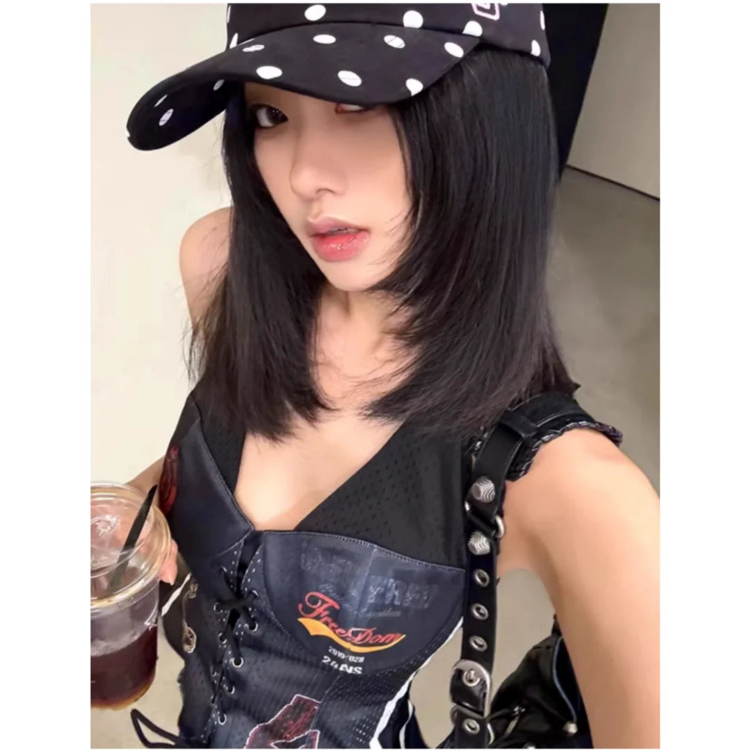 Y2K American Hot Girl Printed Strap Halter Neck Top Summer Sexy Pure Outerwear Vest for Women Waist Slim Design Black Suspender