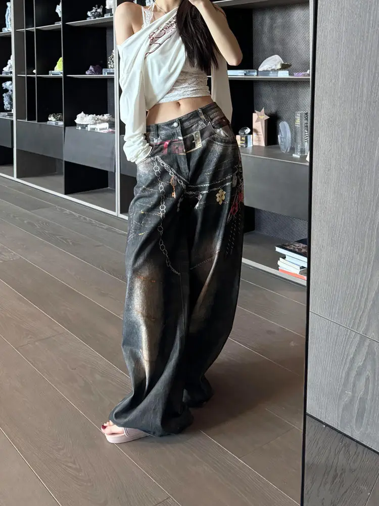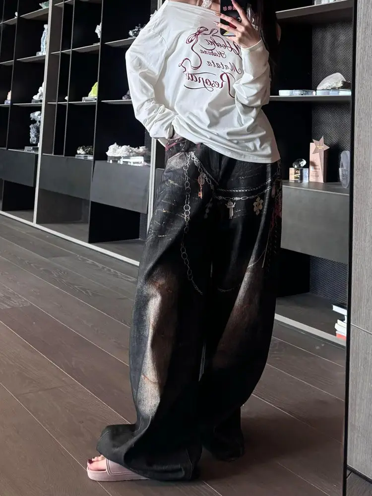 Y2K Retro Block Era Belt Printed Wash Jeans Loose Hot Girls Casual High Street Wide-leg Pants Women's Popular Large-size Pants