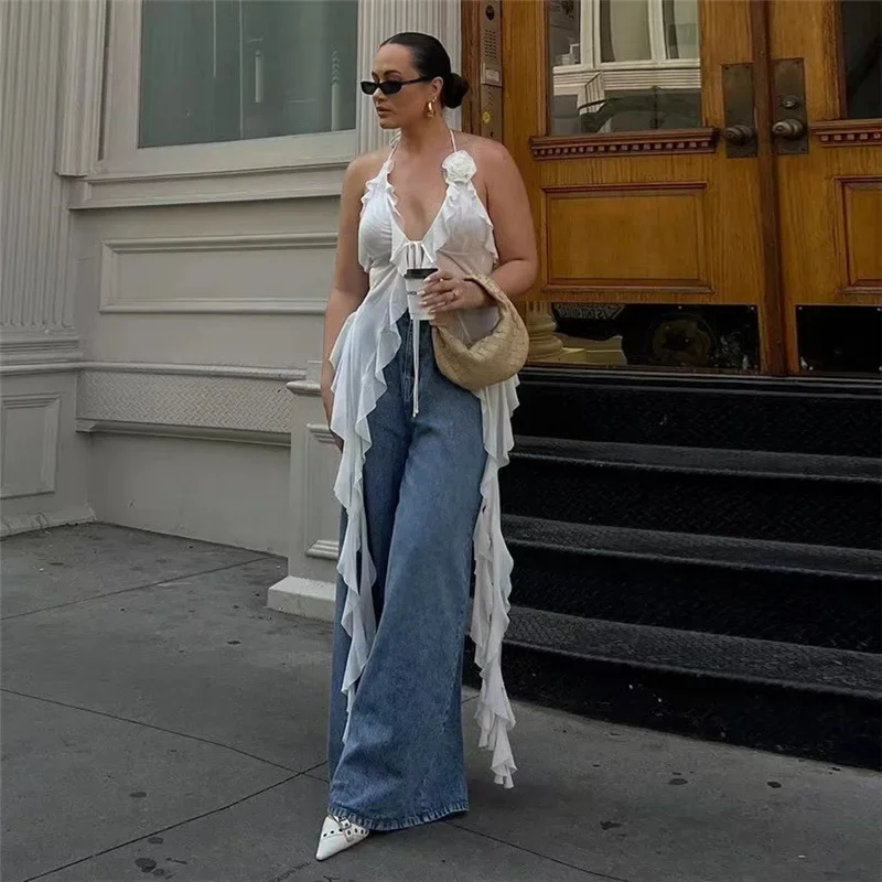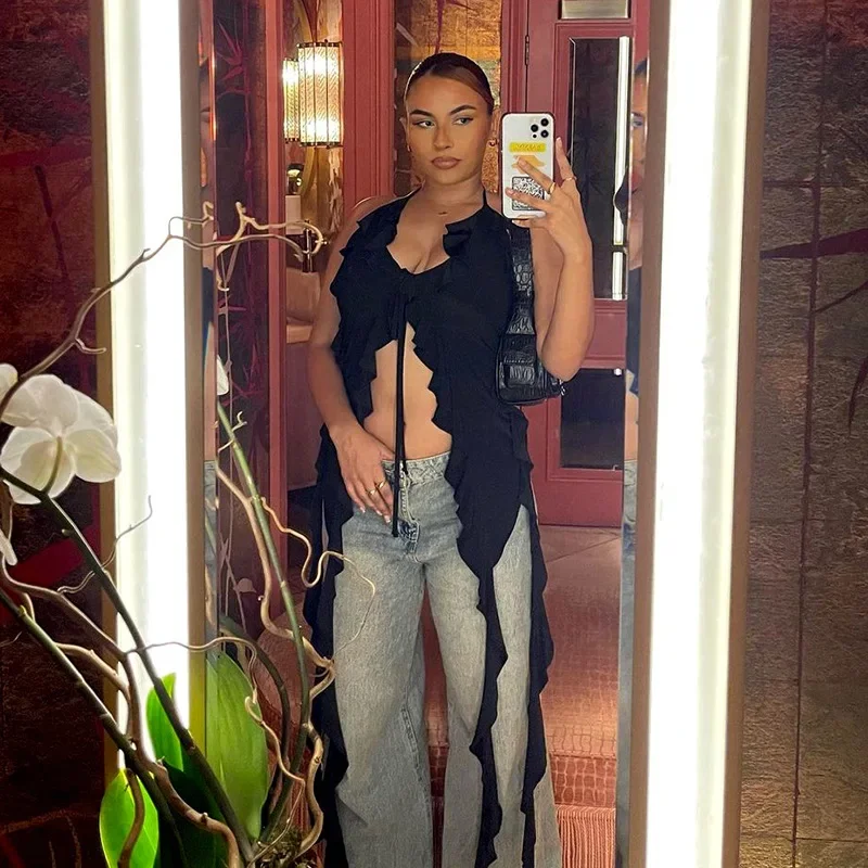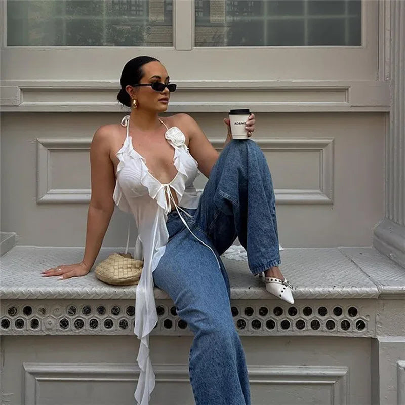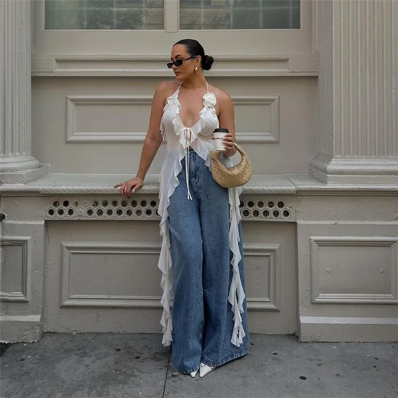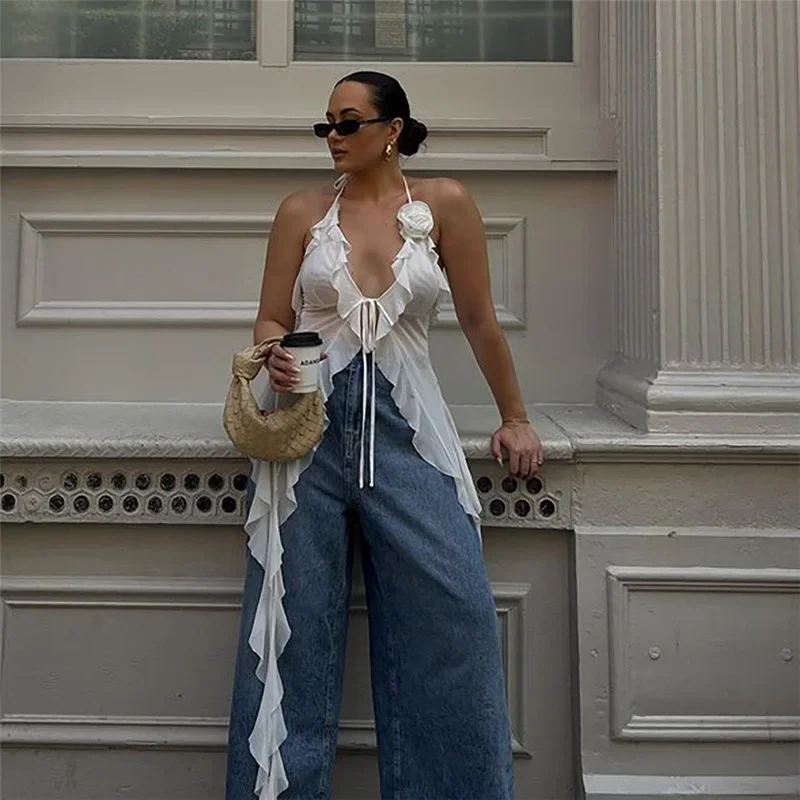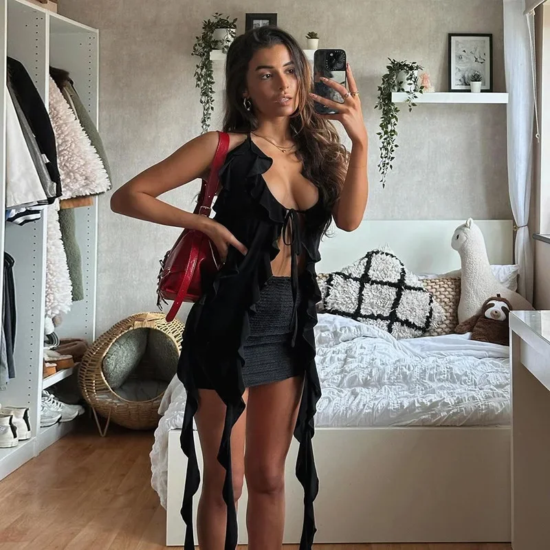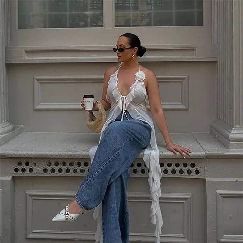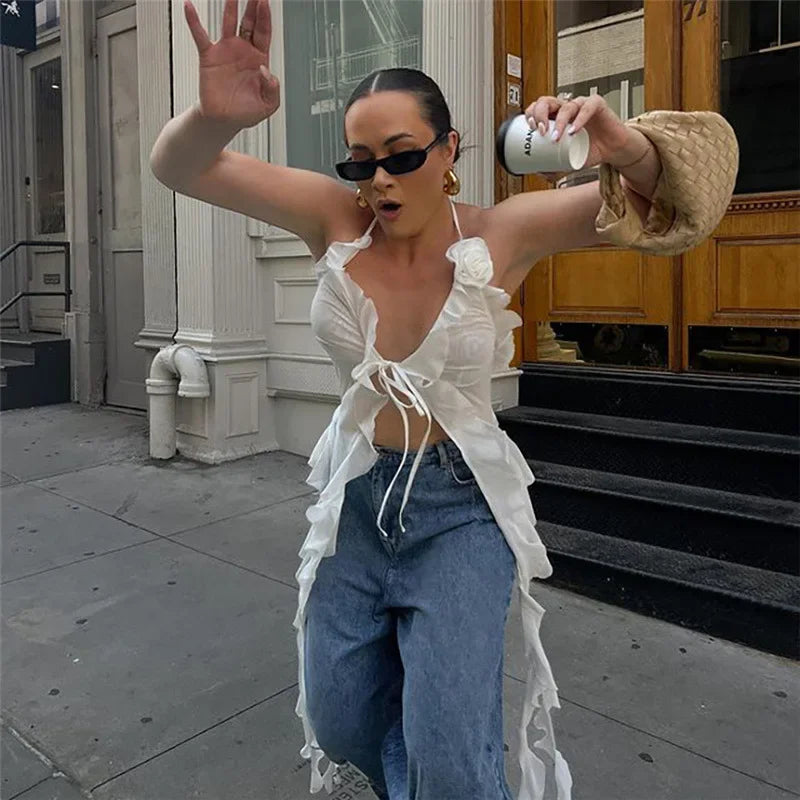Y2K Sheer Mesh Spaghetti Strap Camisole Top White Ruffle Fringe Halter Tops Coquette Fairy Core Clothes 2024 Fashion