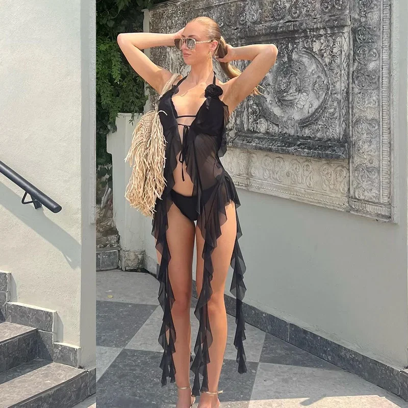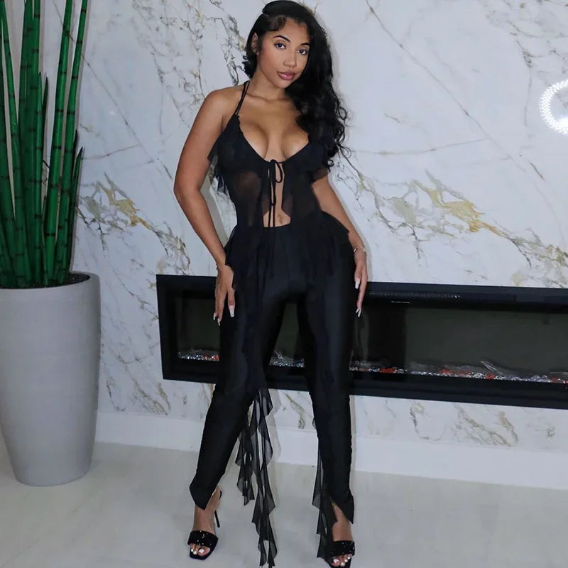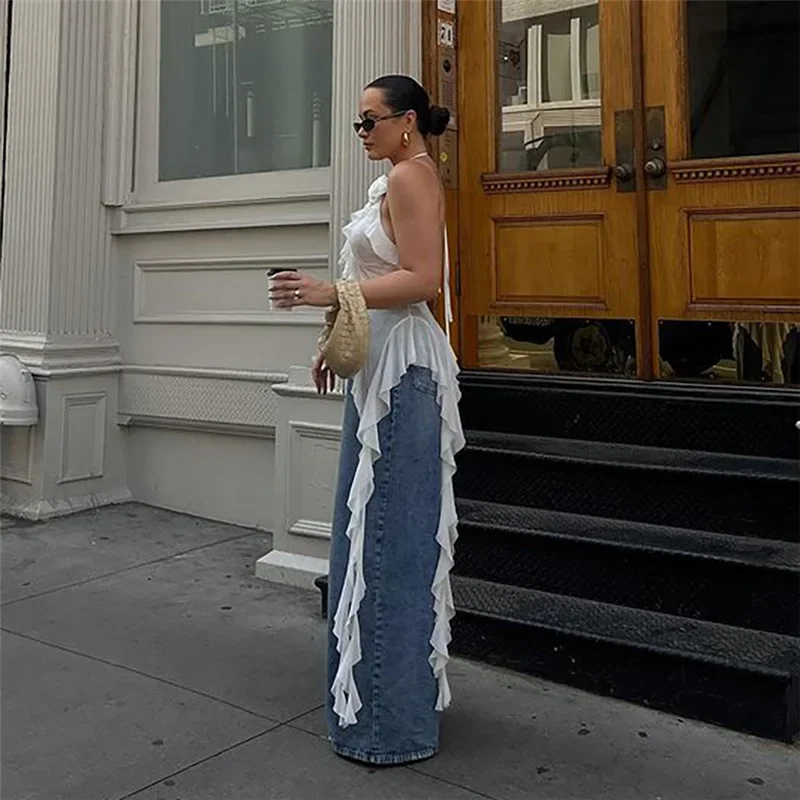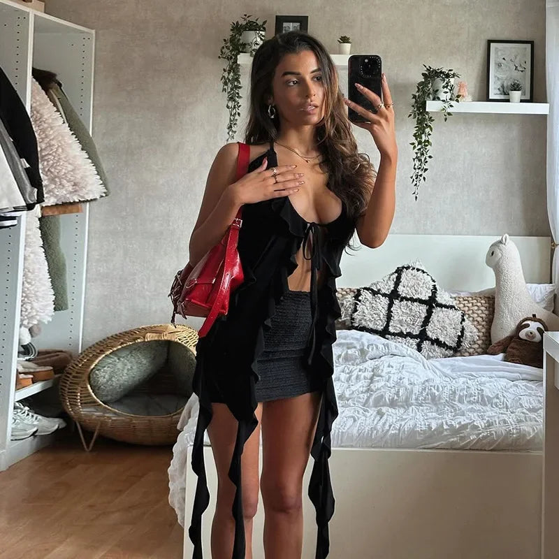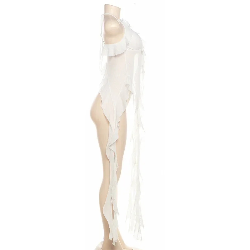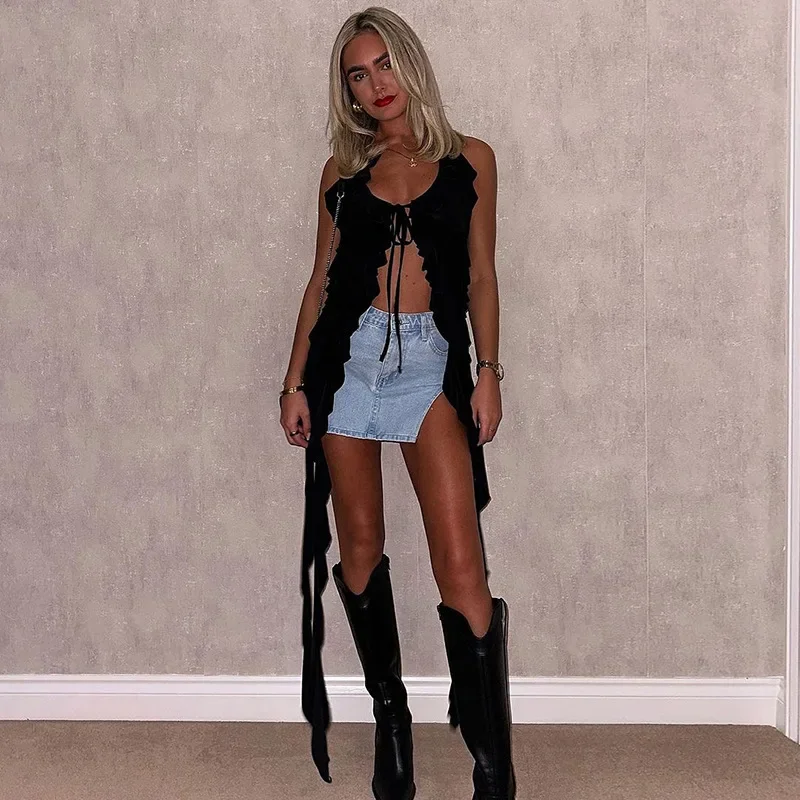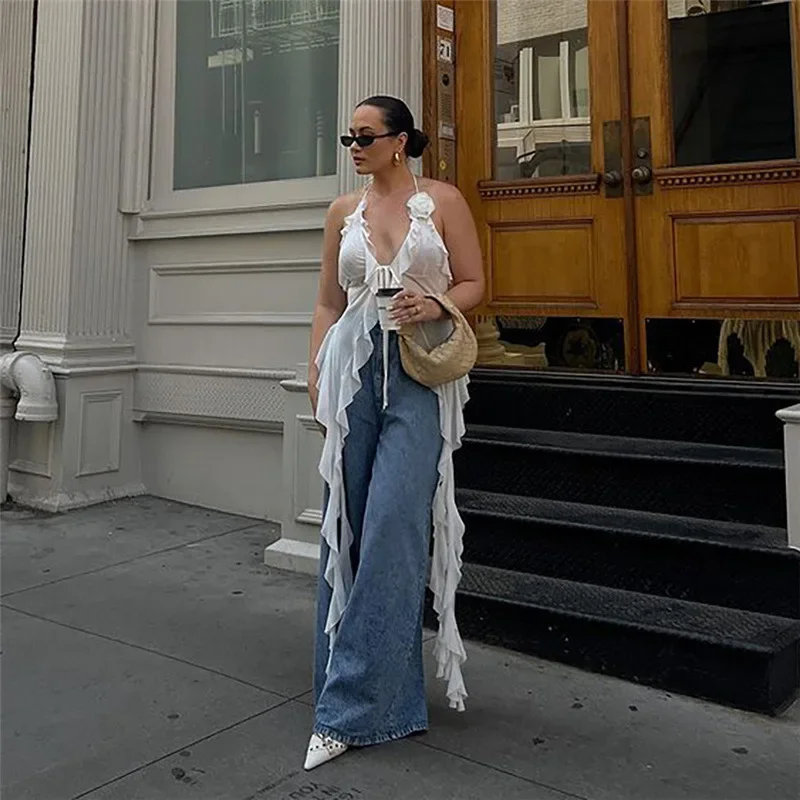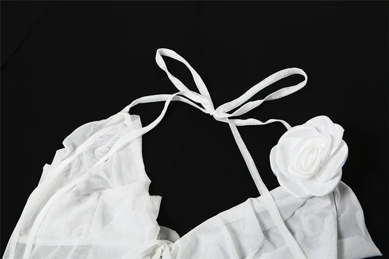 Y2K Sheer Mesh Spaghetti Strap Camisole Top White Ruffle Fringe Halter Tops Coquette Fairy Core Clothes 2024 Fashion