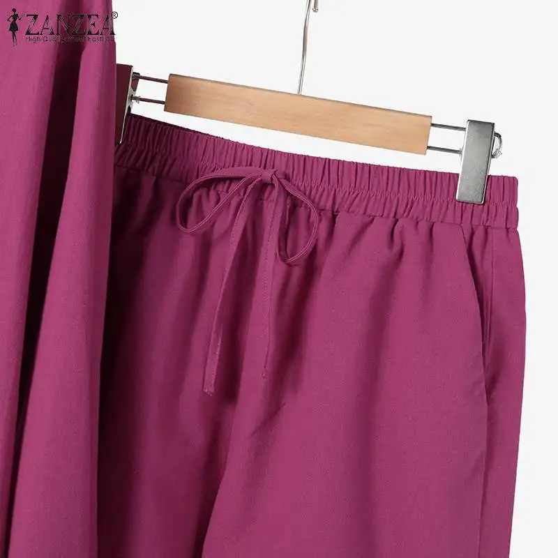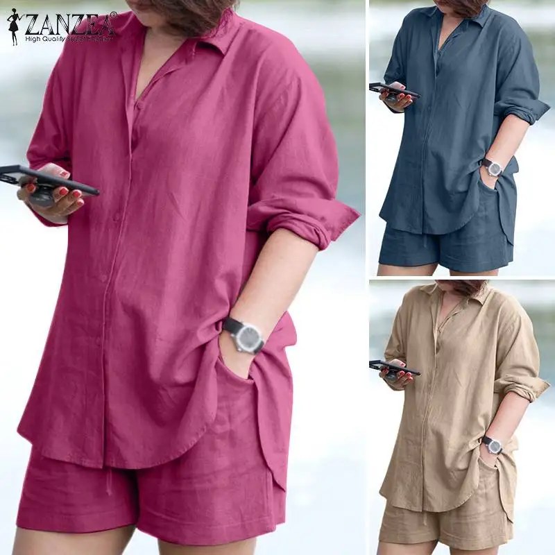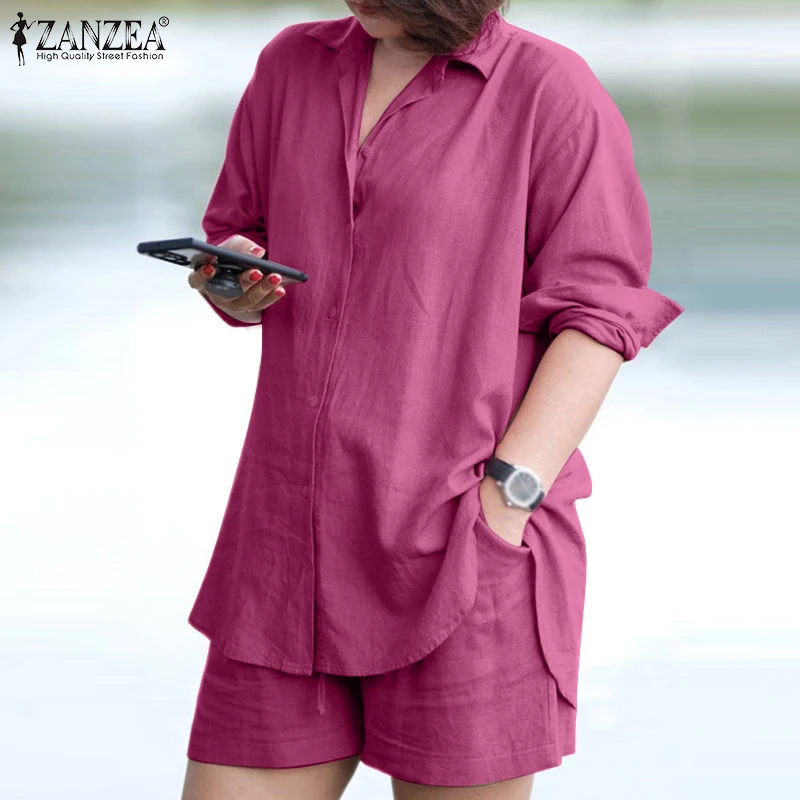 ZANZEA Woman Vintage Solid Matching Sets Spring Casual Street Suit Long Sleeve Lapel Shirt Loose Shorts Elegant Tracksuit