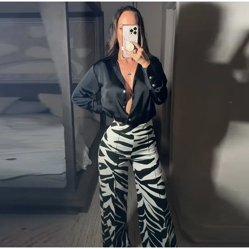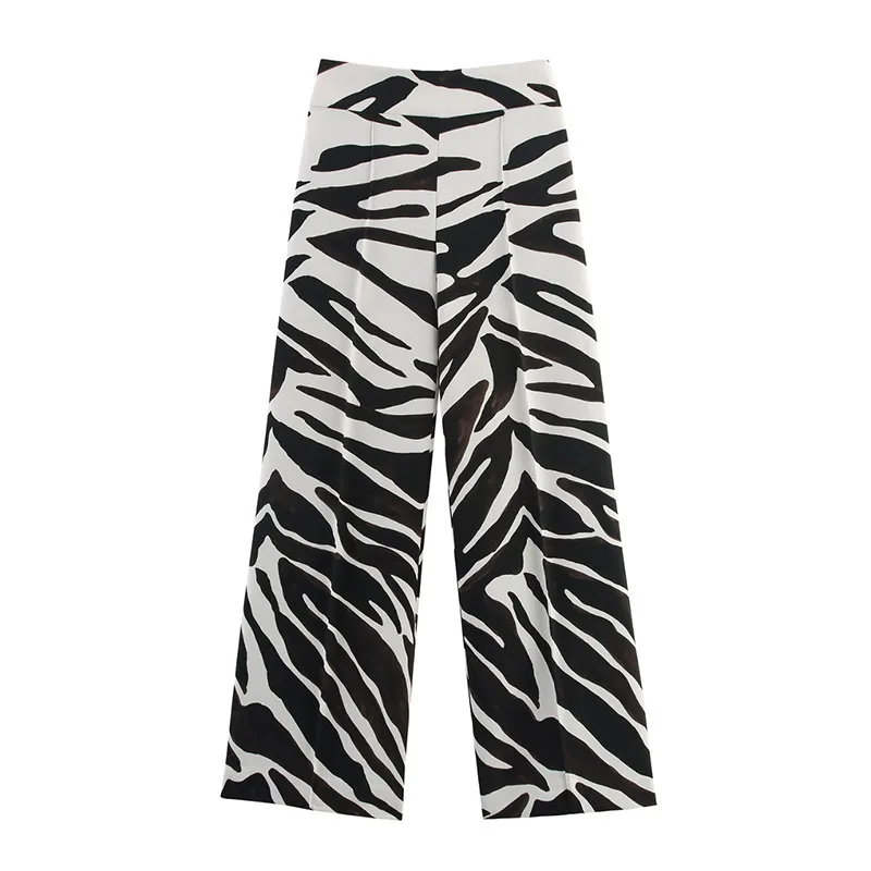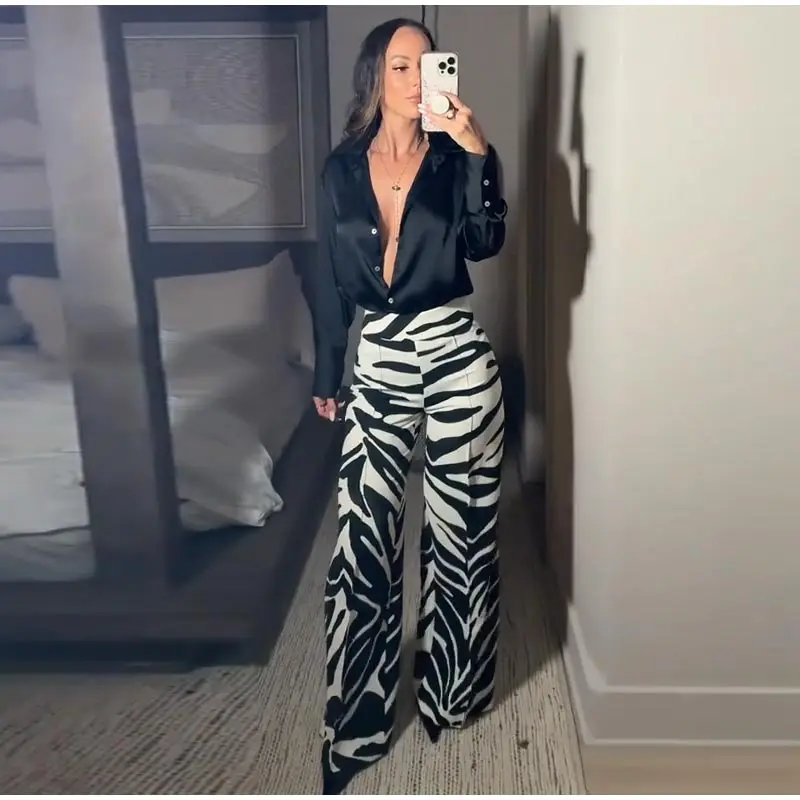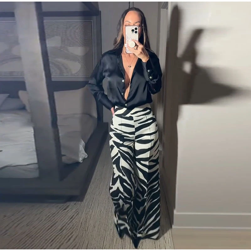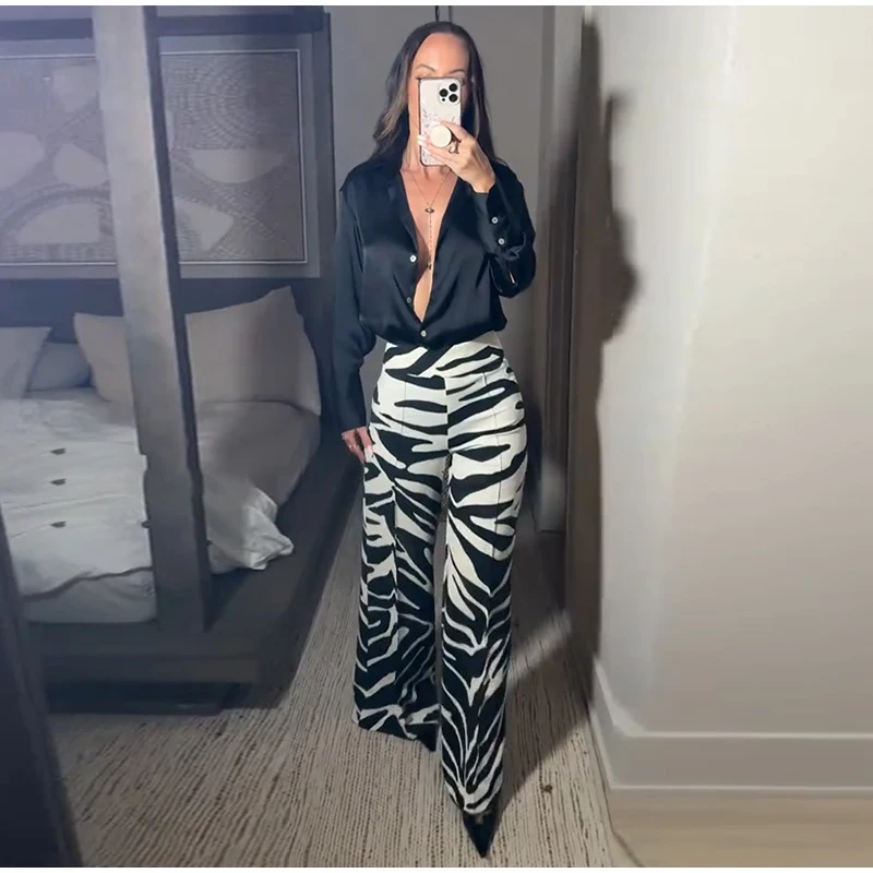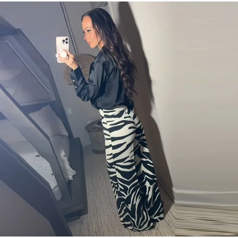Zebra Print Wide Leg Women Pants High Waisted Stretch Fit 2025 Autumn Fashion Elegant Casual Bottoms Office Chic Lady Trousers