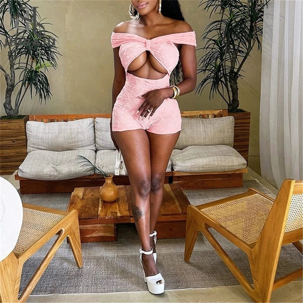 ZHEZHE Summer Pink Offshoulder Bodycon Rompers Party Club Outfit for Women 2024 Y2K Fashion Hollow Out Strapless Sexy Jumpsuits