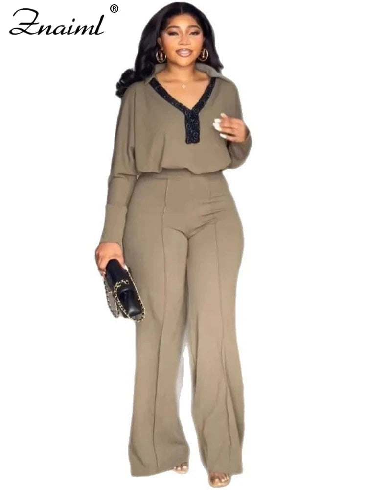 Znaiml Casual Office Lady 2 Piece Sets Women Summer Long Sleeve V Neck Polo Shirt Tops and Wide Leg Pants Streetwear Outfit 2025