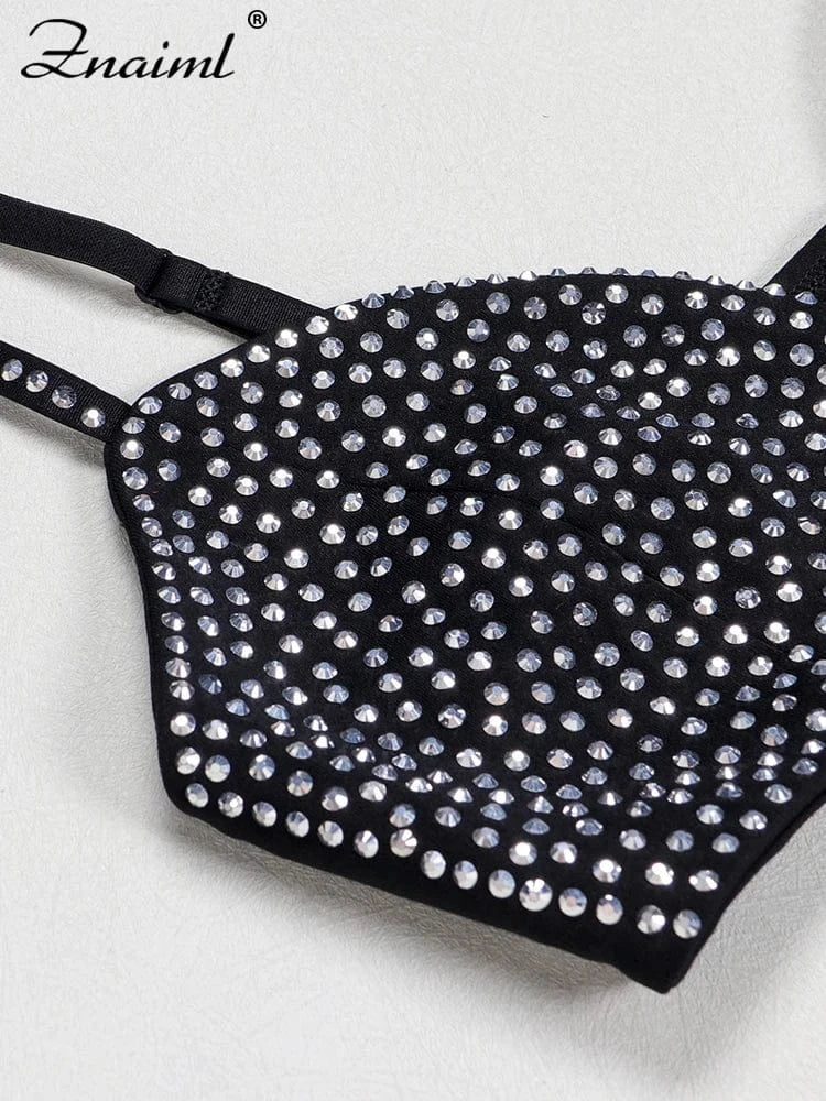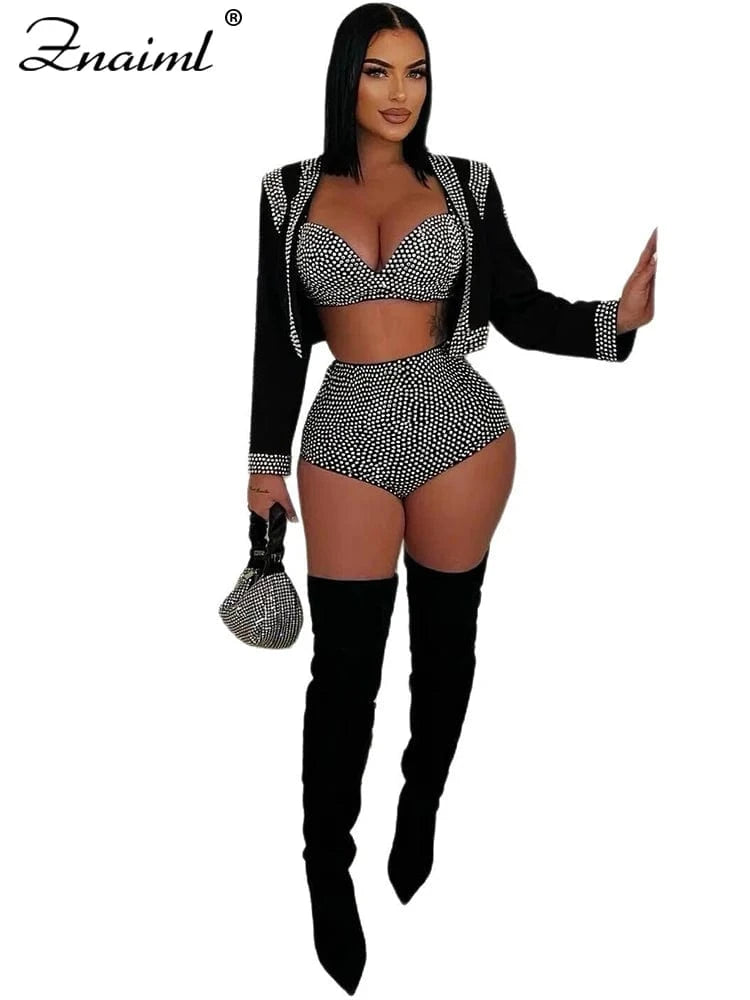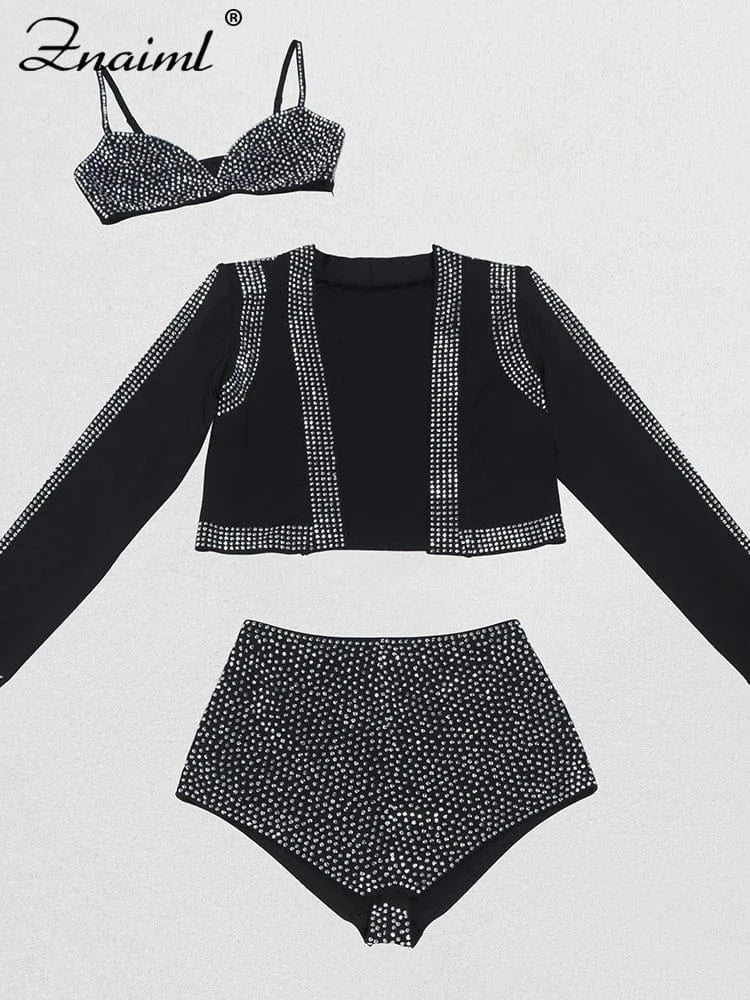 Znaiml Luxury Black Rhinestone Outfits Women Jacket Bra Crop Top and Shorts 3 Pieces Set Elegant Birthday Night Club Prom Suits