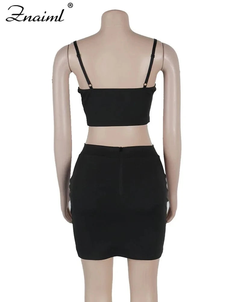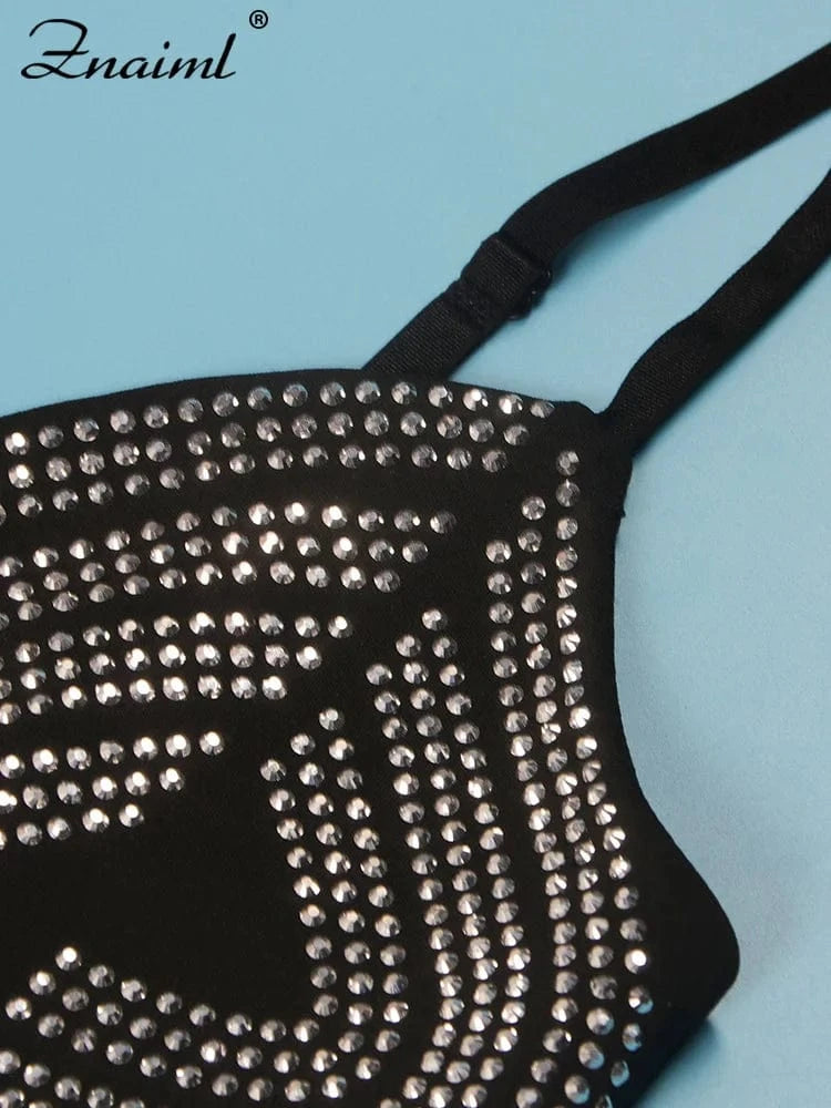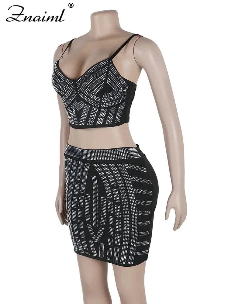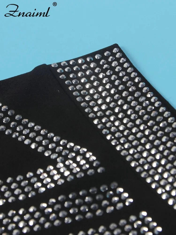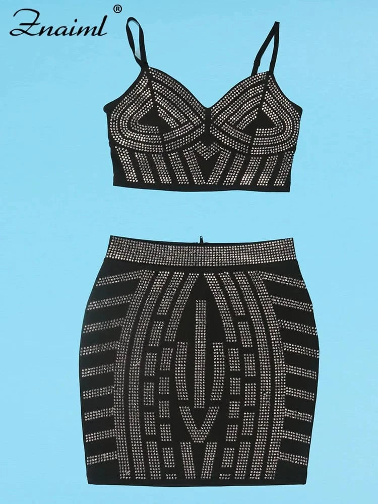 Znaiml Women Summer Two 2 Piece Dress Birthday Outfits Night Club Sparkle Black Rhinestone Crop Top and Mini Skirt Matching Set